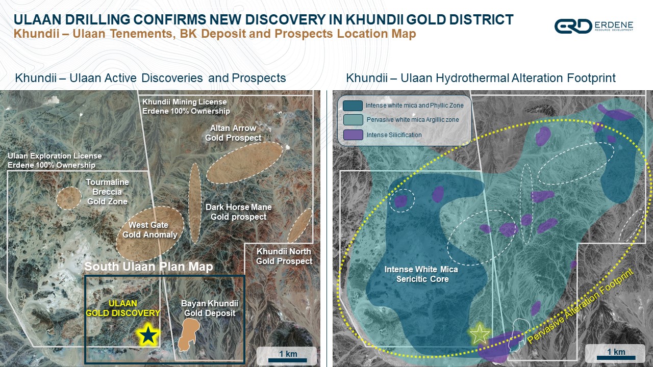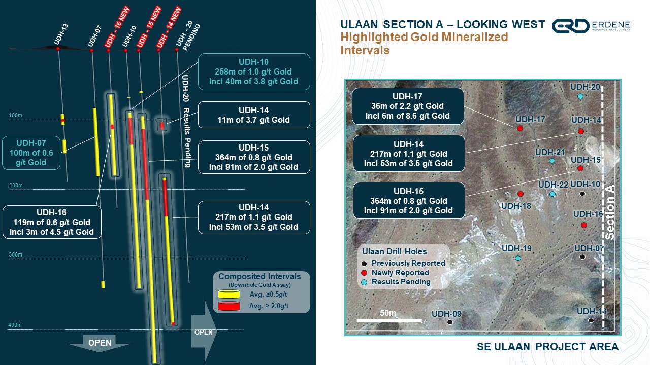 “The Ulaan prospect has proven to be a major new gold discovery within our Khundii Gold District,” said Peter Akerley, Erdene’s President and CEO. “The very broad zones of mineralization, exceeding 200 metres, include multiple intersections exceeding 10 g/t gold and demonstrate the potential scale of Ulaan mineralization, within 300 metres of our Bayan Khundii Gold Deposit. Gold mineralization at Ulaan is open in all directions, and multiple gold in soil and geophysical anomalies remain untested in areas to the west of the discovery.”