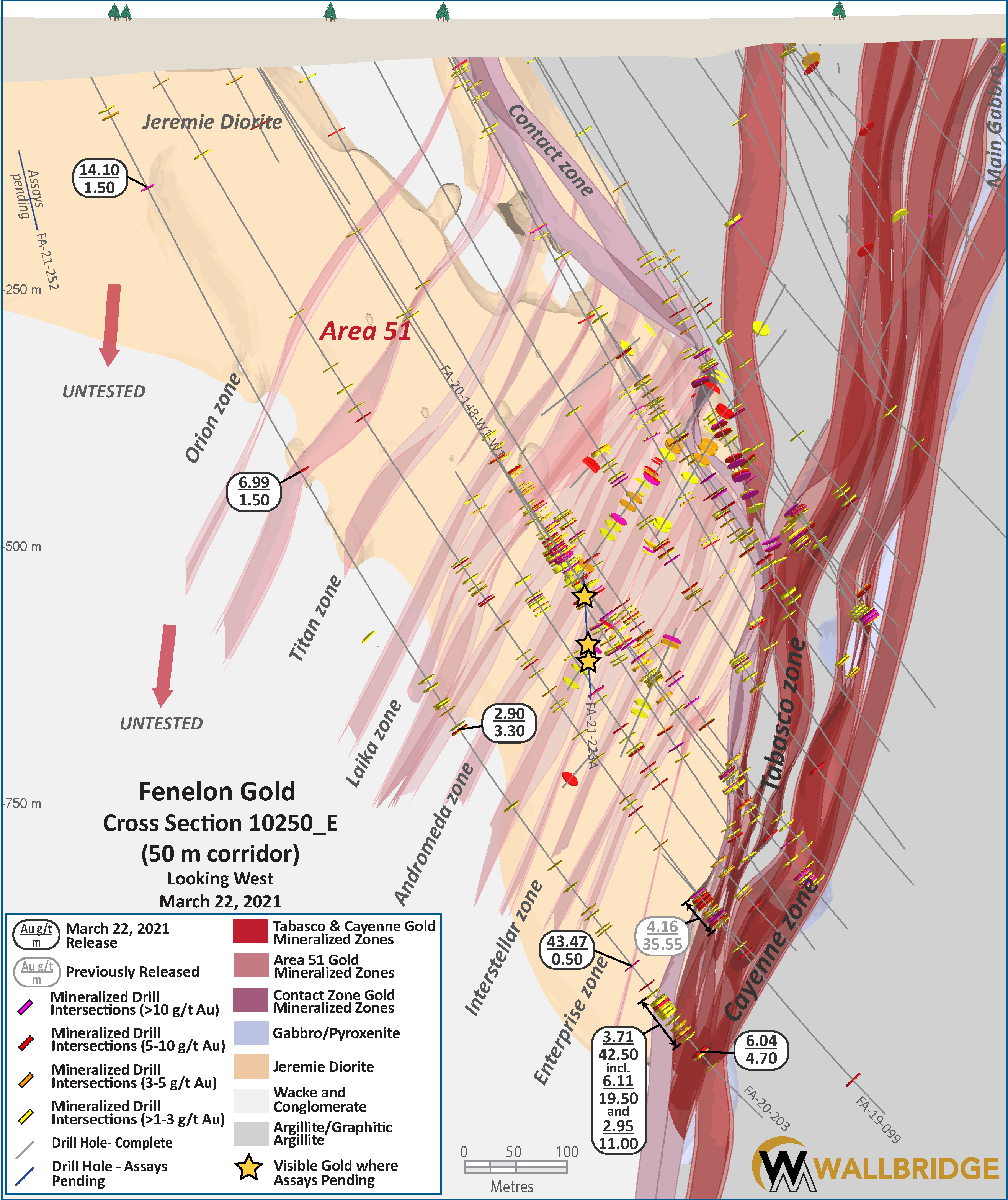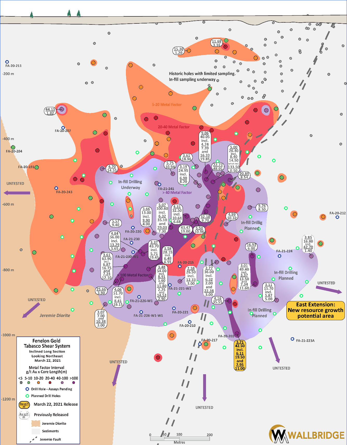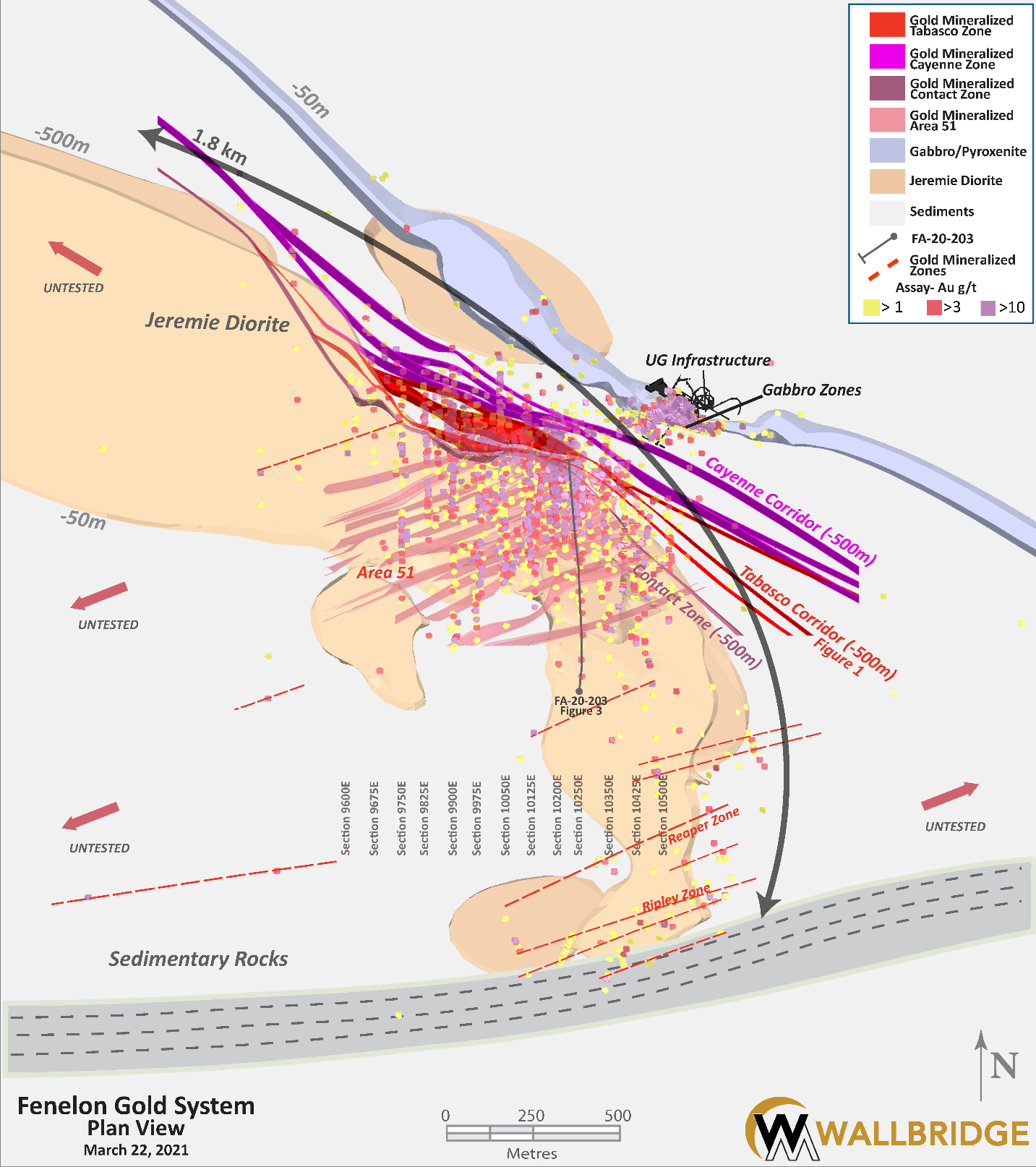 TORONTO, March 22, 2021 (GLOBE NEWSWIRE) -- Wallbridge Mining Company Limited (TSX:WM) (“Wallbridge” or the “Company”) is pleased to announce a significant wide intersection from a newly-discovered depth extension of the Tabasco-Cayenne Zones at the Fenelon Gold Property (“Fenelon” or the “Property”), expanding strong gold mineralization to a vertical depth of 1,000 metres. Drill hole FA-20-203 intersected 3.71 g/t Au over 42.50 metres, including 6.11 g/t Au over 19.50 metres in the recently discovered eastern high metal factor (grade multiplied by core length) domain of the Tabasco-Cayenne zones (see Wallbridge Press Release dated February 17, 2021), approximately 100 metres below a previous intersection of 4.16 g/t Au over 35.55 metres in hole FA-19-099.