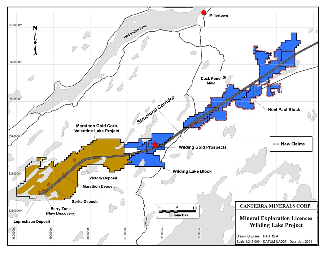 VANCOUVER, British Columbia, Jan. 13, 2021 (GLOBE NEWSWIRE) -- Canterra Minerals Corporation (TSXV:CTM)(OTC Pink: CTMCF) (“Canterra” or the “Company”) is pleased to announce that it has doubled its land holdings in central Newfoundland, along the Rogerson Lake Structural Corridor from 104km2 to 236km2 through staking.