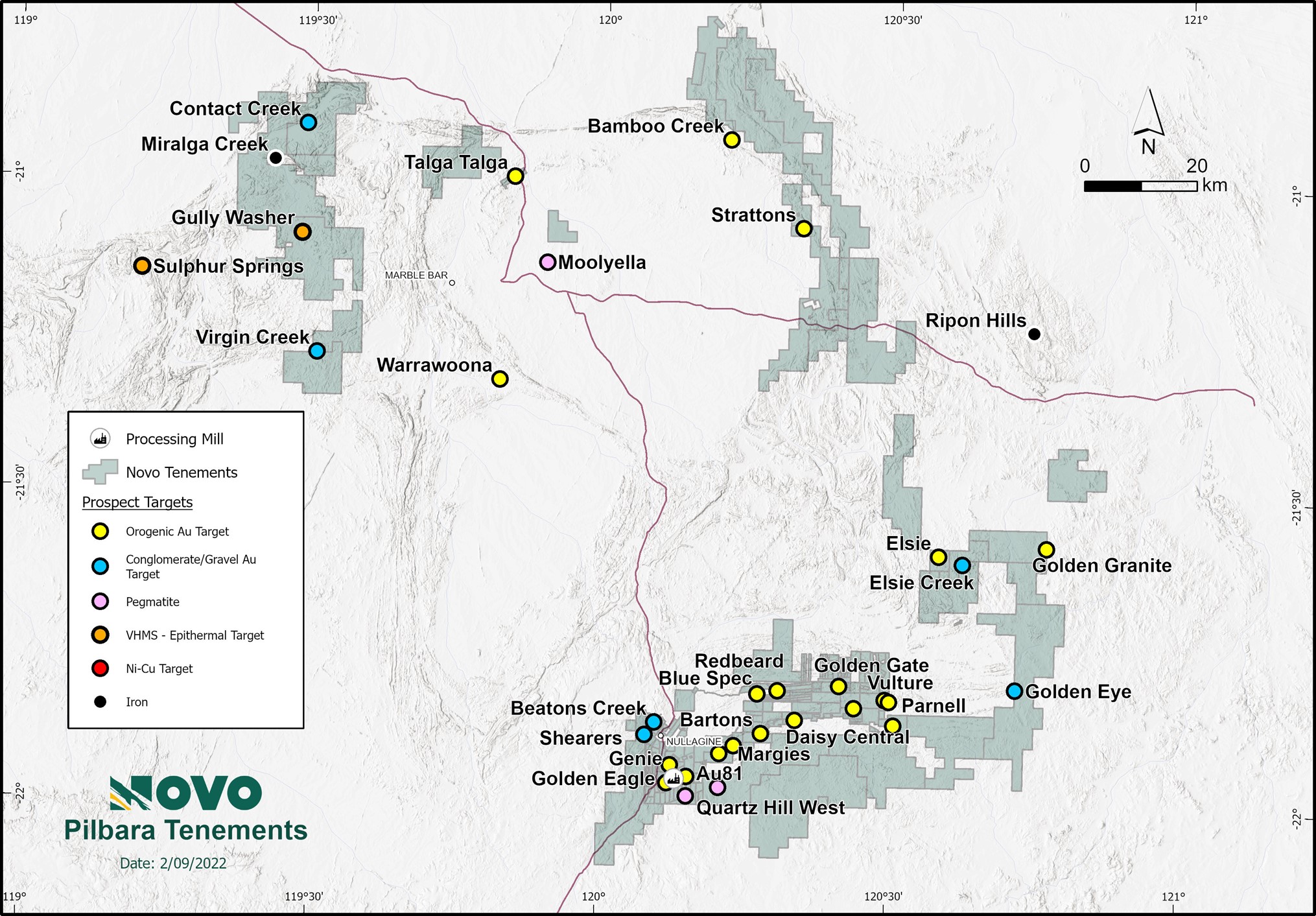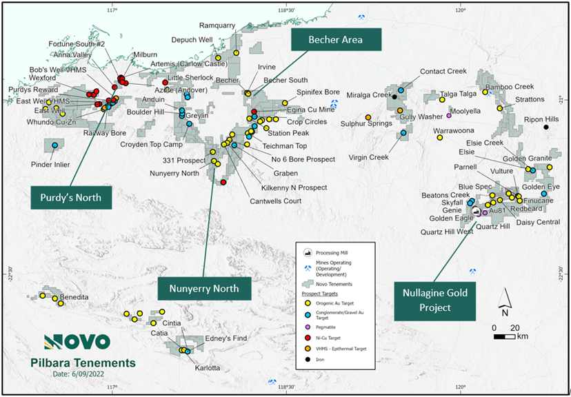 - Comprehensive exploration update regarding large-scale exploration programs underway across Novo’s highly prospective 11,000 sq km portfolio of Pilbara tenements (Figure 1).