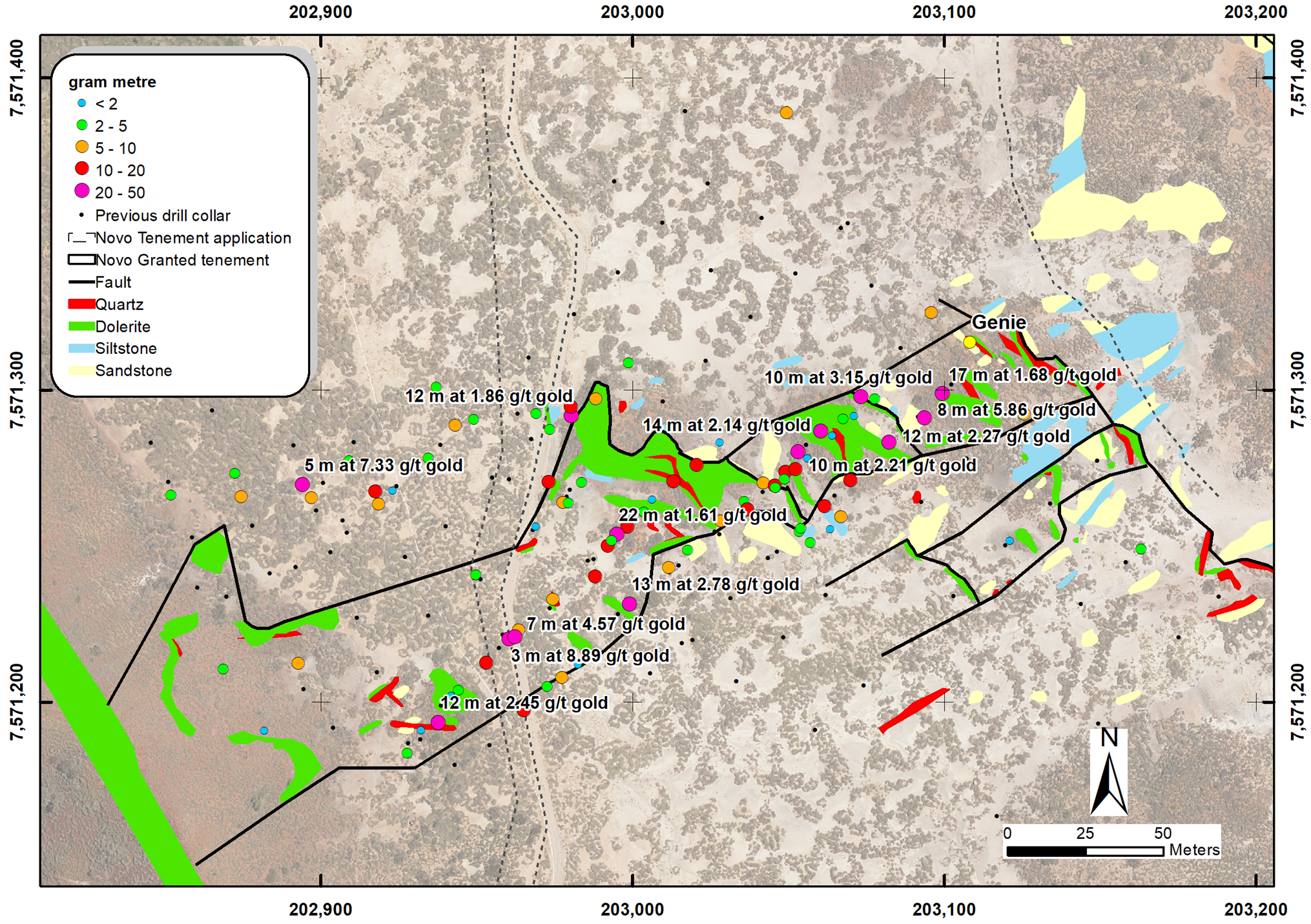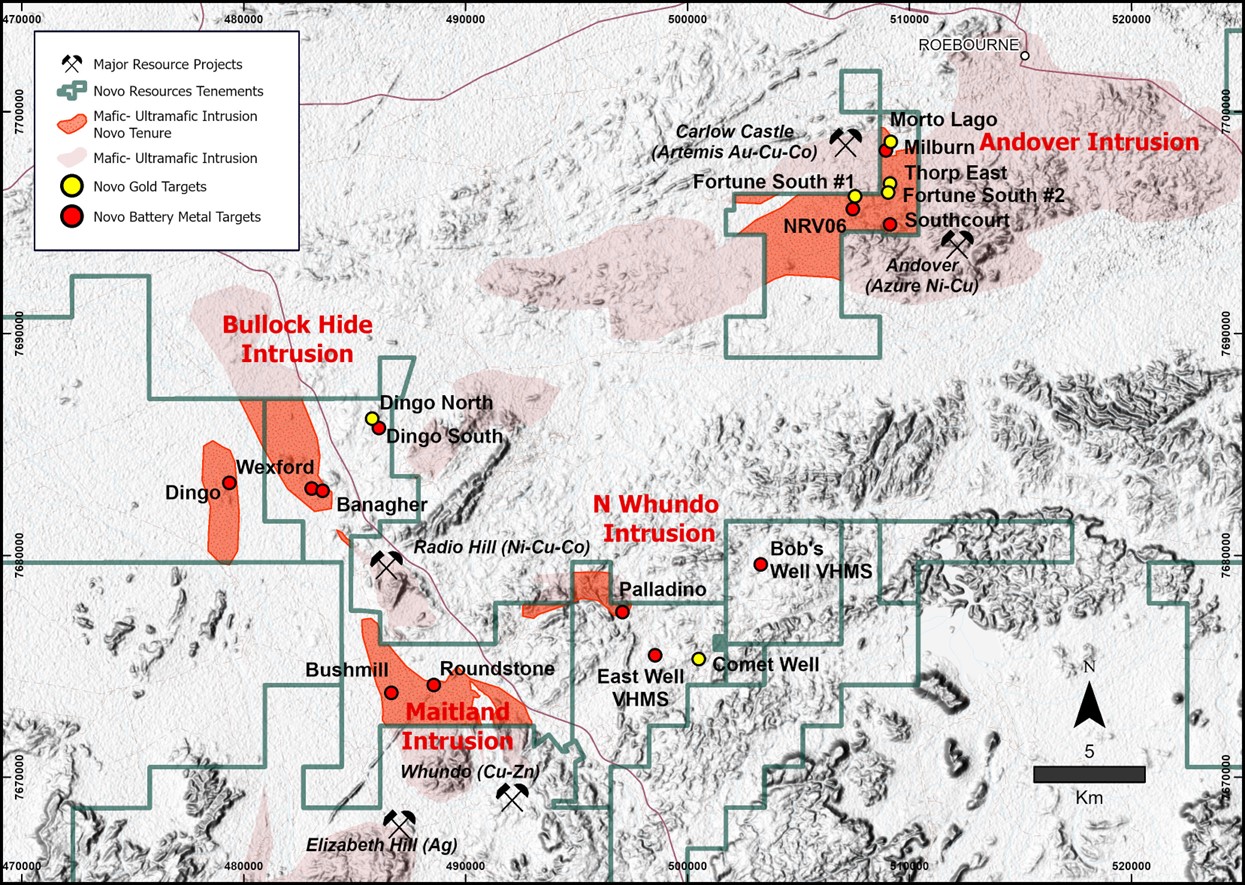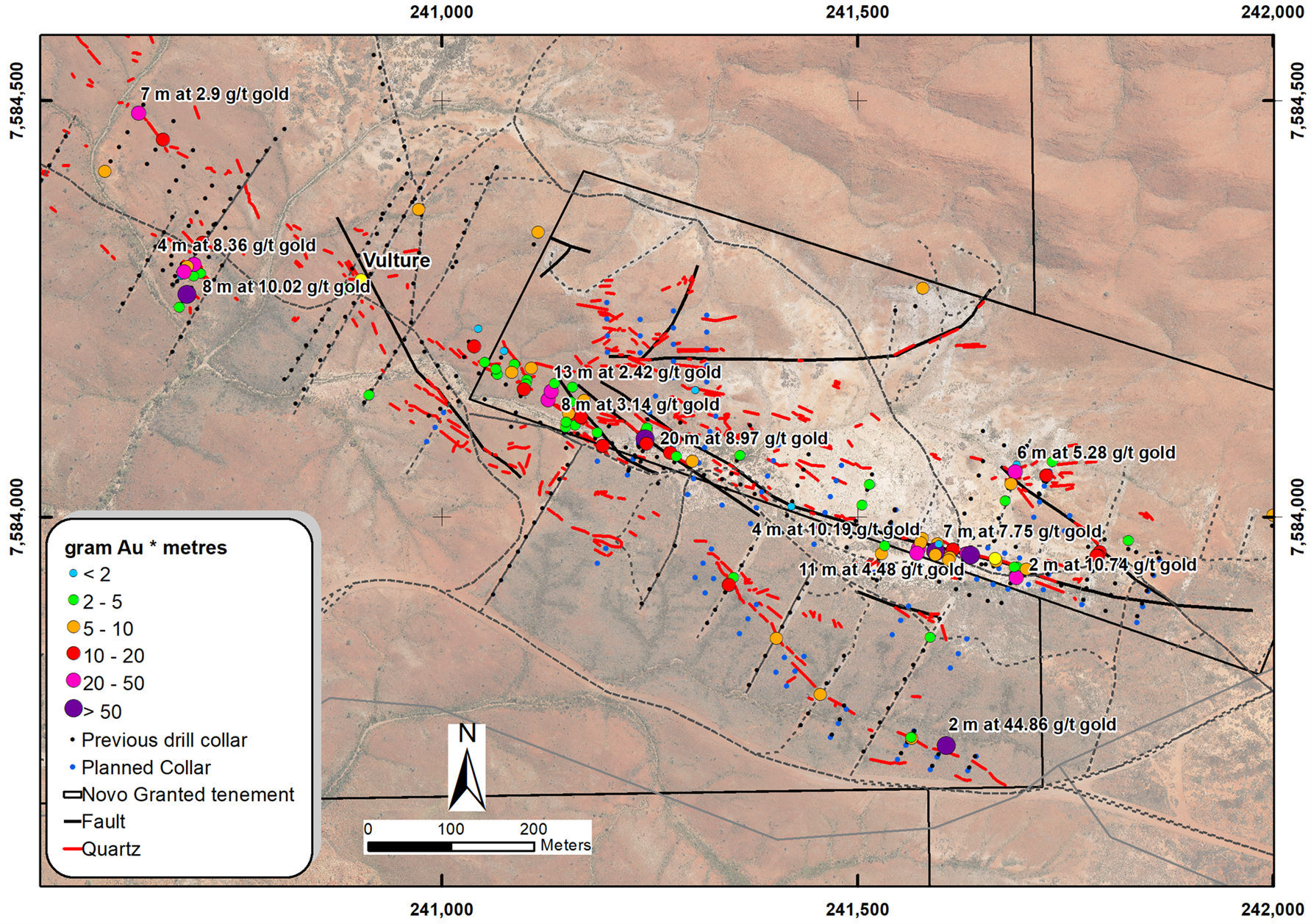 “Our exploration team has built up a plethora of high value drill targets,” commented Dr. Quinton Hennigh, Novo’s Non-Executive Co-Chairman and a director. “With cash in the bank, we are in an excellent position to aggressively tackle each of these targets with systematic first pass drilling. Drilling, which is just getting started, is already turning up very promising intercepts of significant quartz-sulphide veining from Morto Lago, possible magmatic nickel-copper sulphide mineralization at Milburn, and new strong gold intercepts from the Malmsbury Project. We have lots to look forward to, including maiden drilling for Hemi-style mineralization at Egina, further follow up work at the very robust Nunyerry North gold in soil anomaly, and drilling additional strong nickel-copper targets at Karratha. At the same time, we are diligently exploring the NGP to build up inventories of gold mineralization. We are very excited to ramp up our exploration efforts across the Pilbara and look forward to lots of good news to come.”