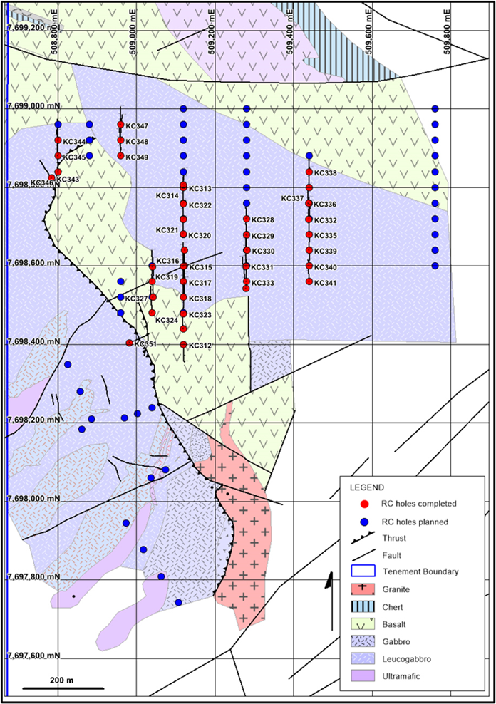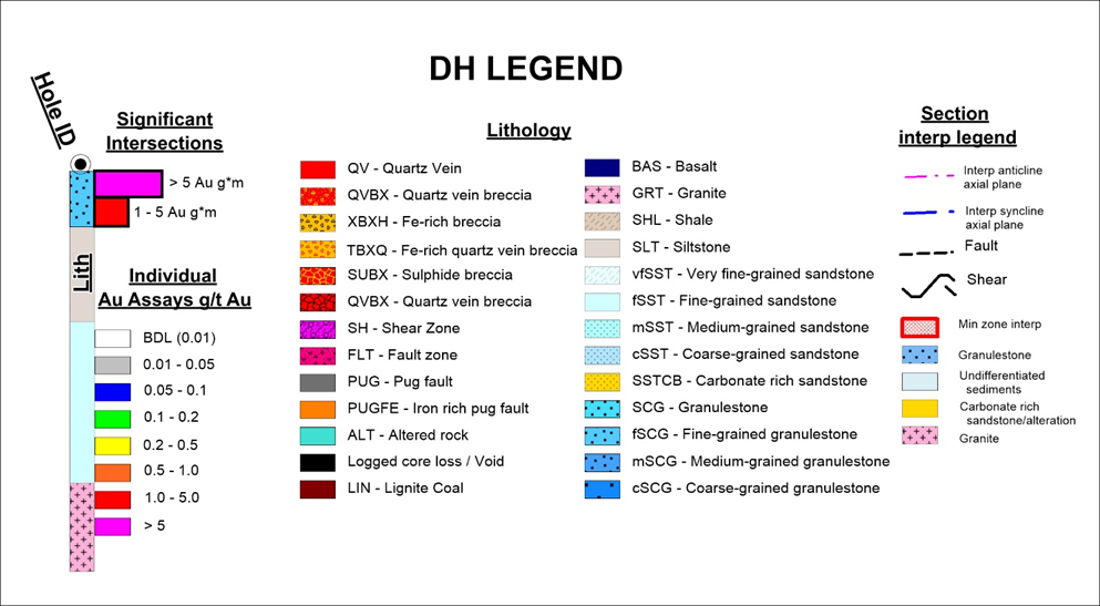 Mineralization comprises multiple lodes of quartz veined intrusive dolerite dykes, possibly controlled by two east-northeast trending structures. Extensional drilling on the western extent of known mineralization (34 RC holes for 2,769 m) were drilled in H1 2022 and returned results including: