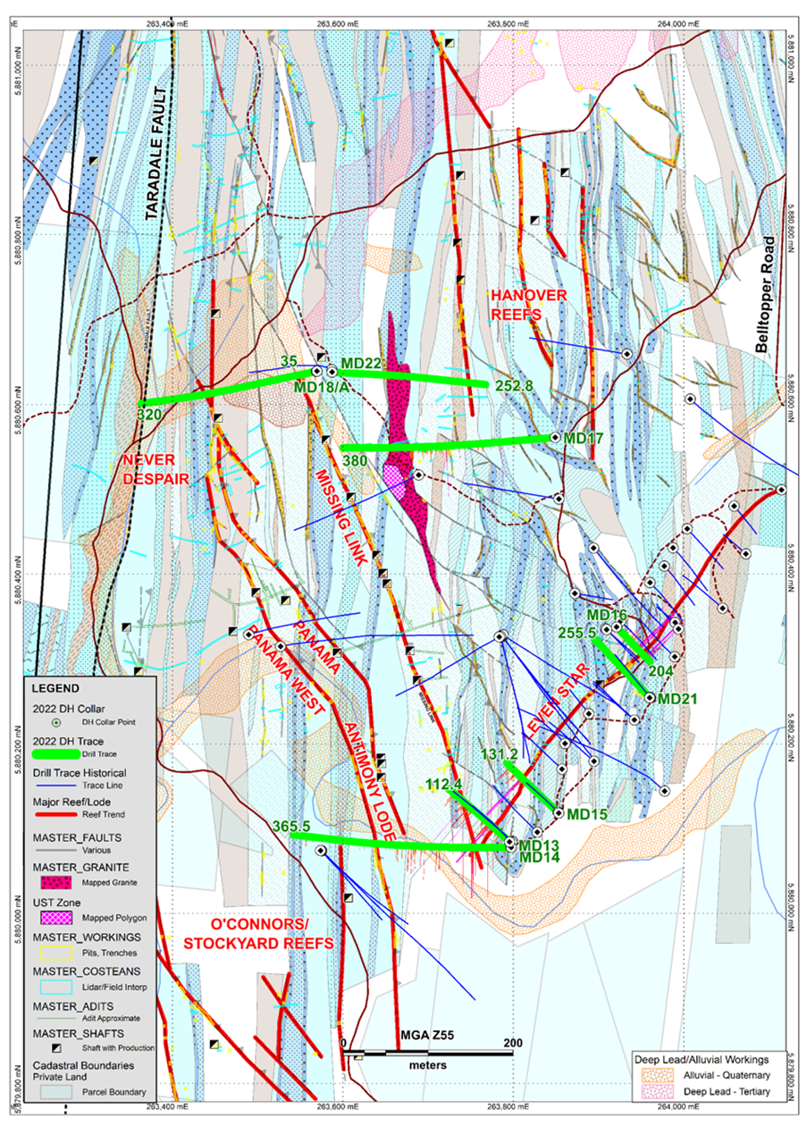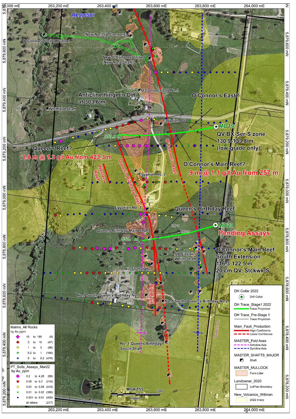 - Additional significant results received to date from the Malmsbury Project program include 7.75 m @ 2.8 g/t gold from 87 m (MD15); 0.95 m @ 10 g/t gold from 102.65 m (MD17). Step-out hole MD22 successfully intercepted the Missing Link Monzogranite 80 m north of the gold-mineralized intrusive in MD171. Gold and multi-element assays for MD20, MD21 and MD22 (final hole) are pending.