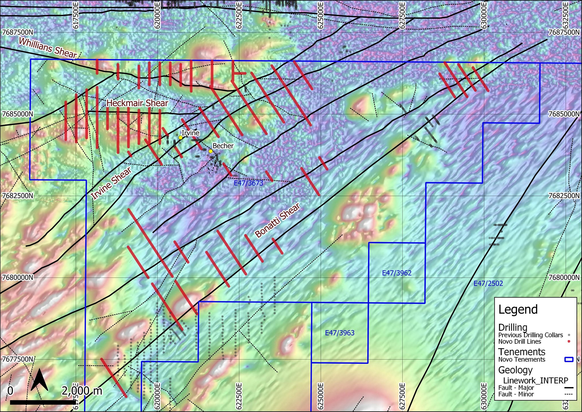 The geology of the Nunyerry North target area includes quartz vein-related gold mineralization within a sequence of ultramafic komatiites and mafic rocks, juxtaposed by regional shears and offset faults. Follow-up work planned includes heritage surveys and logistics for road access in preparation for drilling. Novo’s exploration licence 47/2973 is 70%-owned, with the remaining 30% held by Mark Gareth Creasy and entities controlled by him (the “Creasy Group”)5.