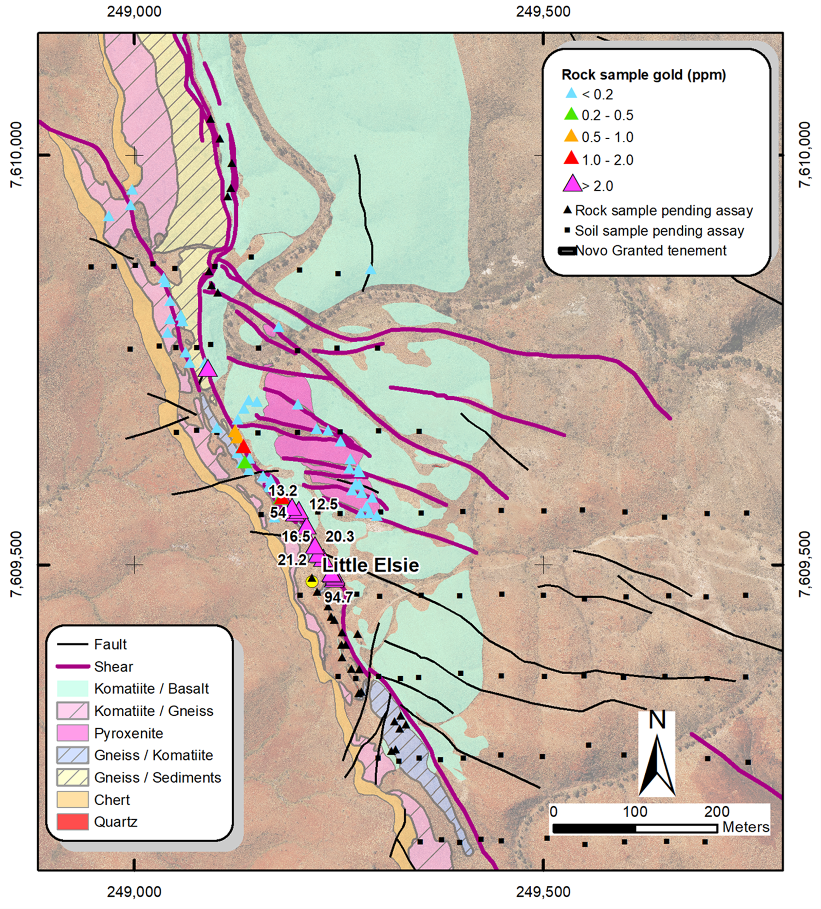 Rock sampling at Little Elsie (Figure 17) focused on historical workings covering approximately 100 m of sheared and chloritized komatiite hosting mineralized quartz veins. The first batch of 80 rock samples included a maximum assay of 94.7 g/t gold, and 19 rock samples returned grades higher than 1 g/t gold. The samples obtained from the 100 m of strike extent averaged 24.5 g/t gold, with further anomalous results extending the trend by 200 metres averaging 1.1 g/t gold. The structural corridor is mapped, and rock sampled further to the north, where structural complexity appears to terminate mineralization. The trend is open to the south for approximately 5 km, which has been covered by a soil sample grid for which assays are pending.