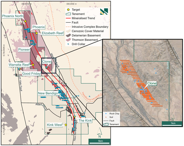 - At the Tibooburra Gold Project, 962 soil and rock chip samples have been collected for assay over a 2.8 km trend at Clone.