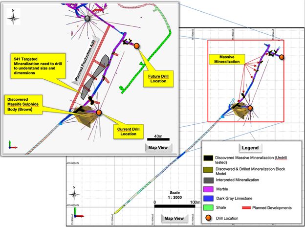 It is now planned to continue the Fourth-Adit a further 400 to 500 metres, over the next year, into the Akkaya license where similar marble formations and anomalous zinc mineralization has been discovered by surface drilling. Continued drilling of Akkaya from above ground is not feasible because of the surface topography. By accessing Akkaya from underground, the drilling program will be further expanded to test the property.