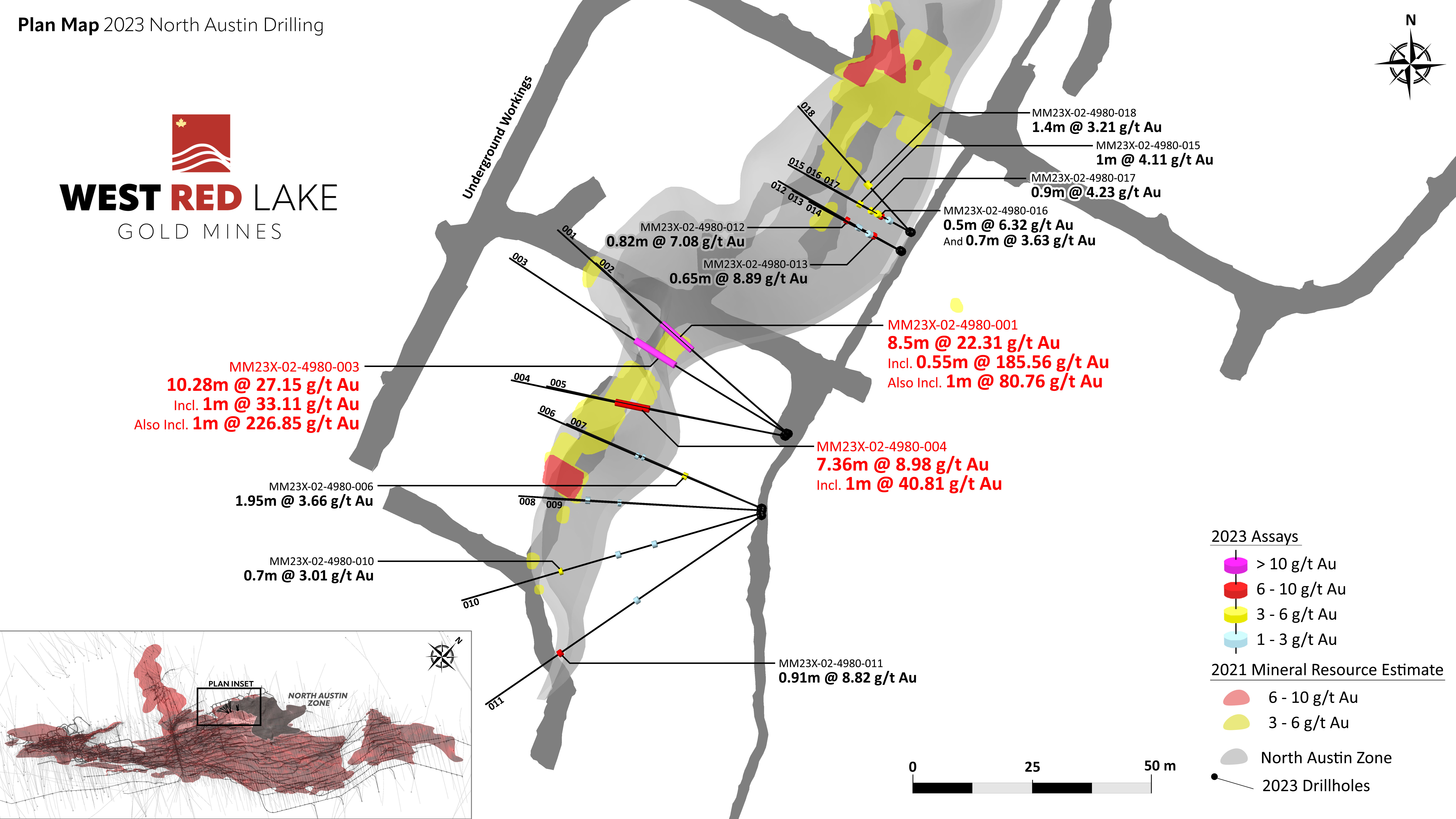 FIGURE 3. North Austin plan view drill section showing assay highlights for Holes MM23X-02-4980-001 through -018.[1]