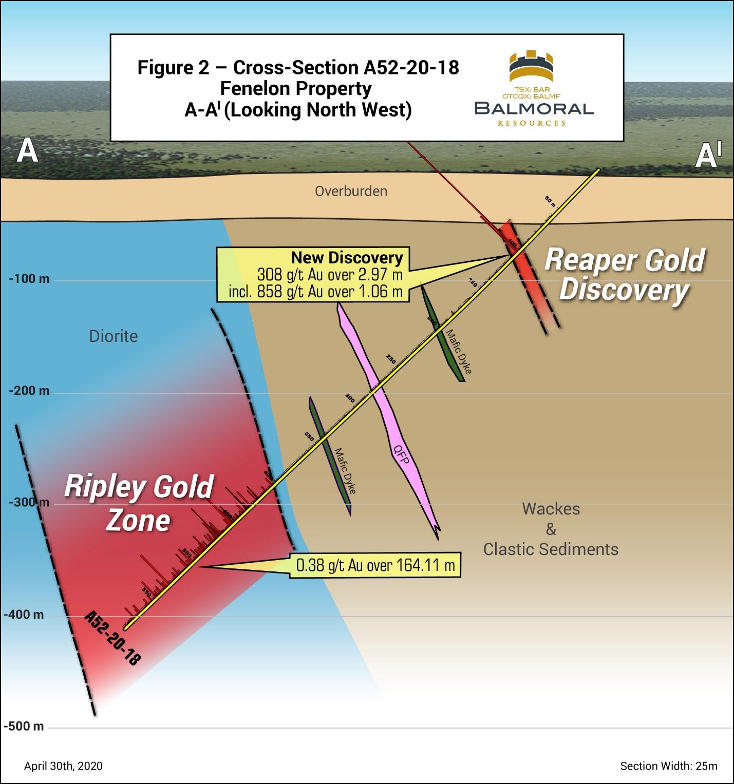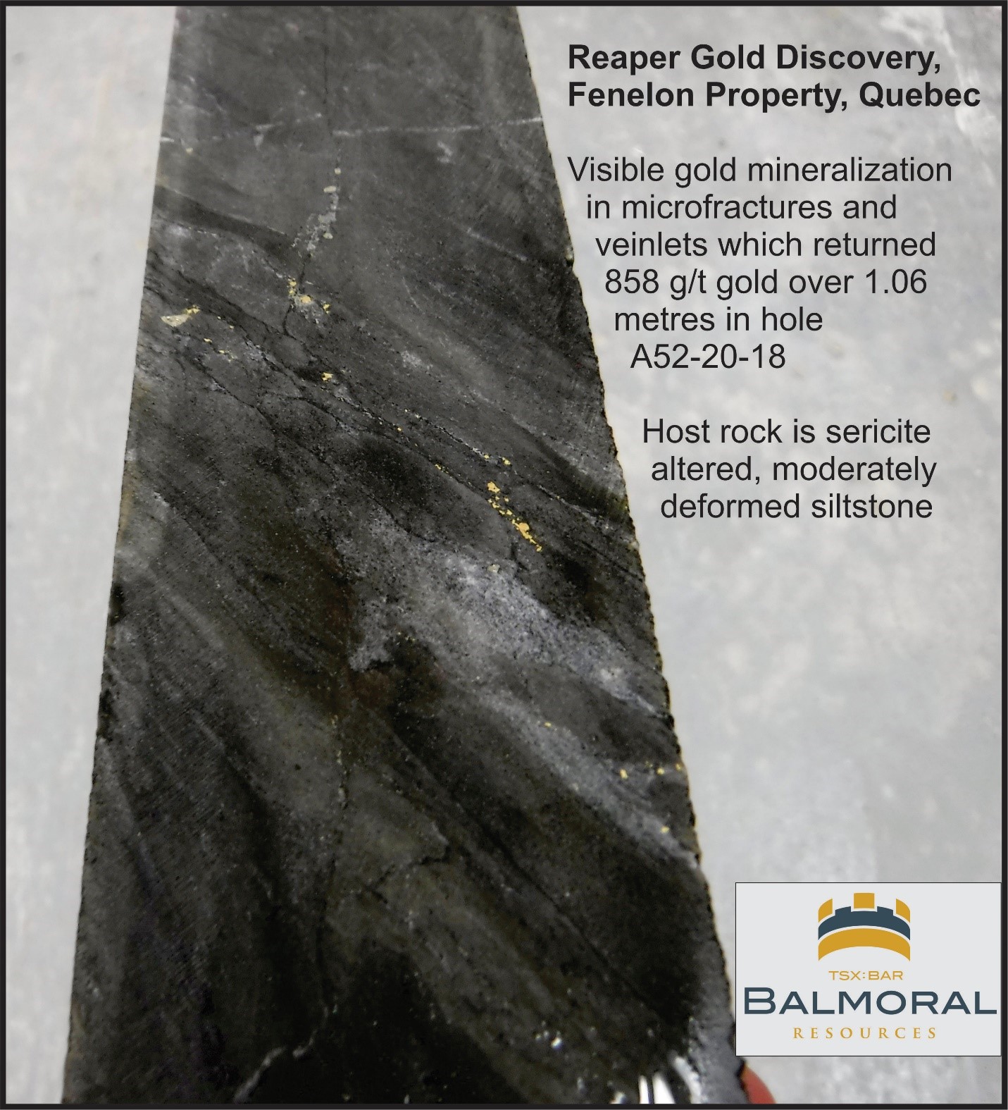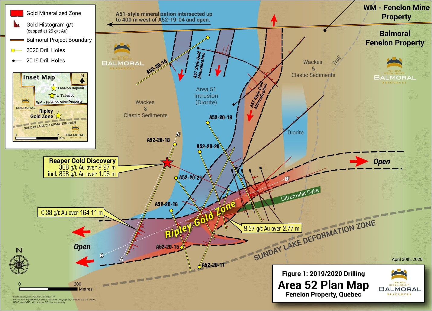 VANCOUVER, British Columbia, May 01, 2020 (GLOBE NEWSWIRE) -- Balmoral Resources Ltd. (“Balmoral” or the “Company”) (TSX: BAR; OTCQX: BALMF) announced today a new, very high-grade gold discovery on its Fenelon Property in Quebec. The Reaper gold discovery returned an intercept of 858.00 g/t gold over 1.06 metres, as part of a broader 2.97 metre wide mineralized zone grading 307.89 g/t gold. The Reaper discovery occurs along the western margin of the Area 51 intrusion on the southern part (Area 52 segment) of the Company’s Fenelon Property (see Figure 1). Wallbridge Mining Company Limited’s (“Wallbridge”) high grade Tabasco Zone occurs along the eastern margin of the same intrusion on the adjacent Fenelon Mine Property. Balmoral’s Fenelon Property forms part of the Company’s district-scale Detour Gold Trend Project in Quebec.