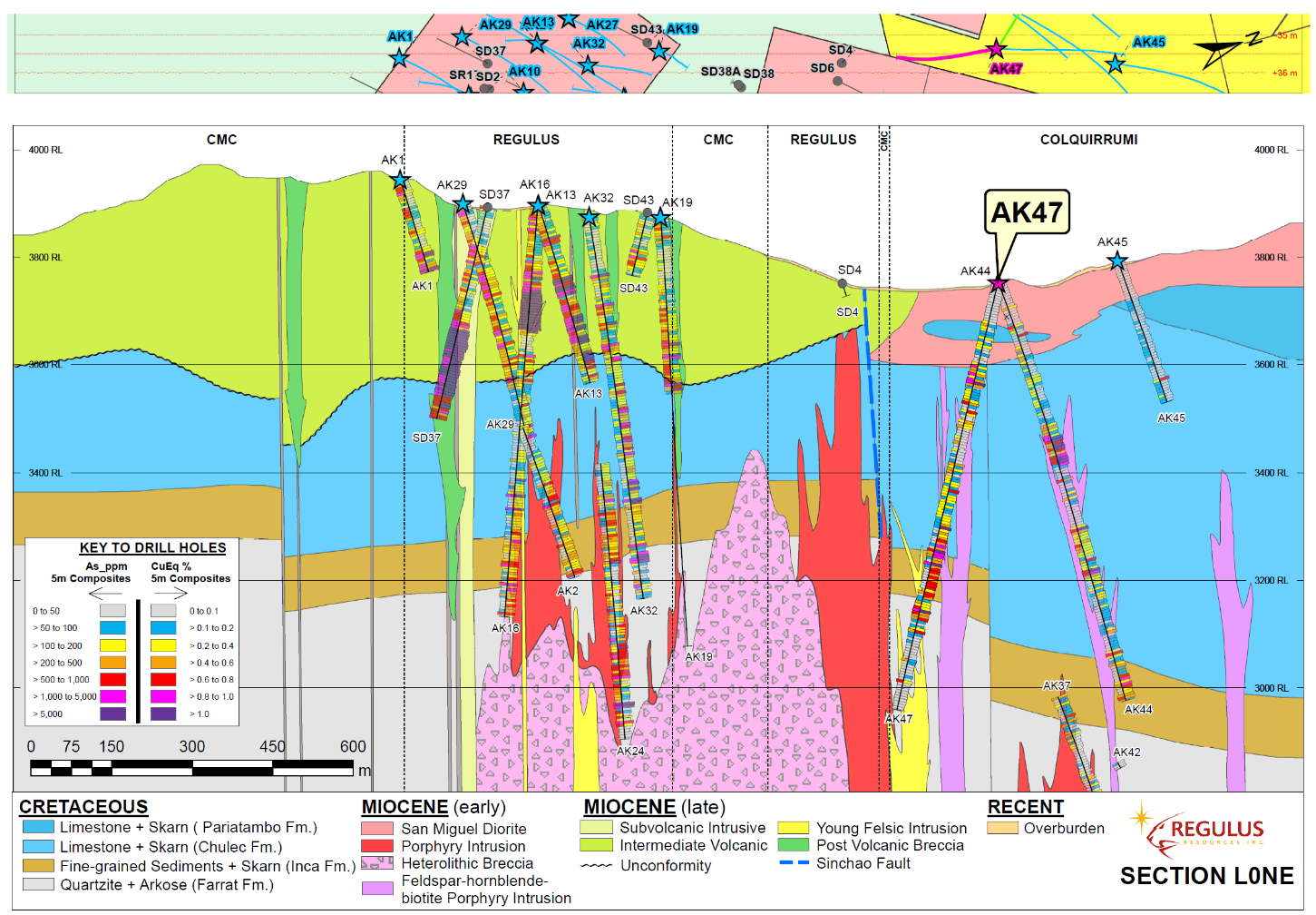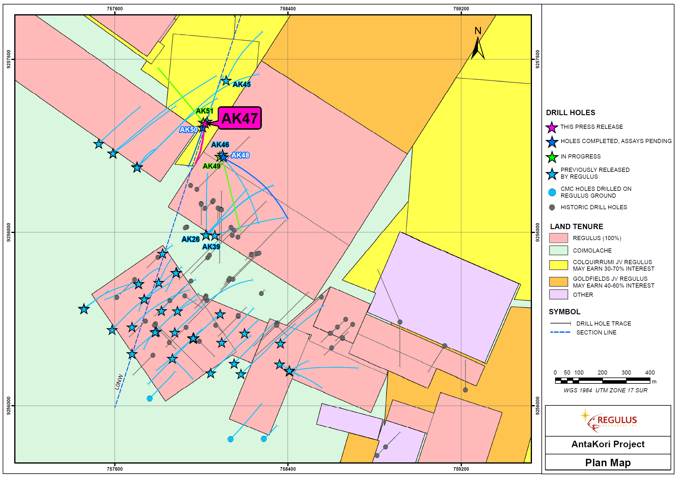 VANCOUVER, British Columbia, May 26, 2022 (GLOBE NEWSWIRE) -- Regulus Resources Inc. ("Regulus" or the "Company", TSX-V: REG, OTCQX: RGLSF) is pleased to report the results from drill hole AK-22-047 from the AntaKori copper-gold project in Peru. The goal of this drill hole was to test the continuity of skarn mineralization intercepted in holes to the east and west. In addition, the hole was drilled entirely on Colquirrumi claims, where the Company has the right to earn up to a 70% interest by completing 7,500 m of drilling (see press release dated May 18, 2016). Hole AK-22-047 successfully intercepted skarn mineralization and contributed 816.70 m of drilling meterage towards the Colquirrumi earn-in agreement.