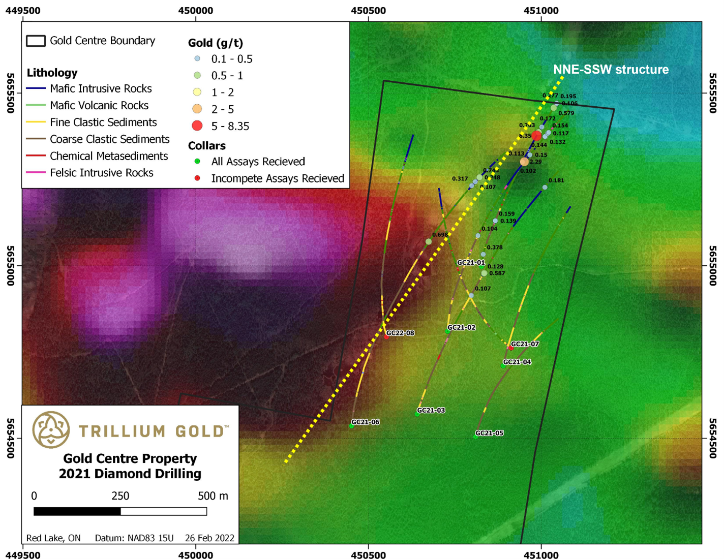 - Trillium Gold receives six of eight drill hole results from the 2021 drill program at the Gold Centre Property comprising 9,329 metres targeting Red Lake Mine stratigraphy