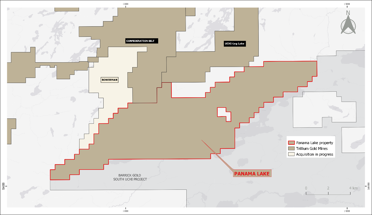 VANCOUVER, British Columbia, June 01, 2022 (GLOBE NEWSWIRE) -- Trillium Gold Mines Inc. (TSXV:TGM, OTCQX:TGLDF, FRA:0702) (“Trillium Gold” or the “Company”) is pleased to announce that it has signed a Purchase and Sale Agreement (the “Purchase Agreement”) to acquire all of the rights and title to the Panama Lake Property (the “Property”) held by St. Anthony Gold Corp. (“St. Anthony Gold”). The Panama Lake Gold Project is located approximately 80km from, and on the same structural trend as, Kinross Gold’s Dixie deposit and effectively extends Trillium Gold’s dominant contiguous foothold along the Confederation belt by 9,882 hectares (see Figure 1).