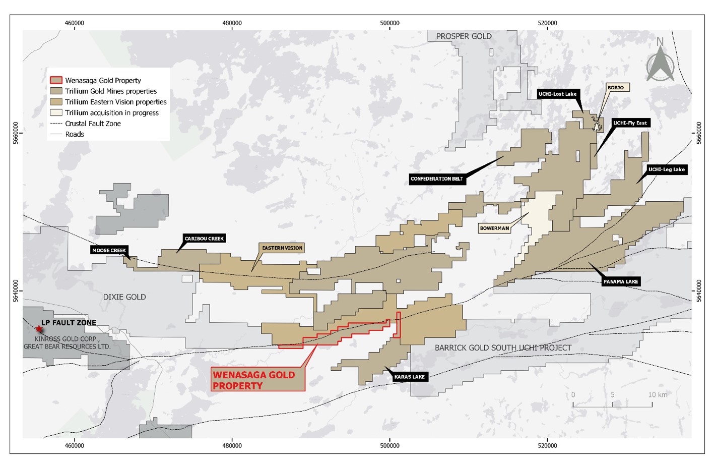 VANCOUVER, British Columbia, June 02, 2022 (GLOBE NEWSWIRE) -- Trillium Gold Mines Inc. (TSXV:TGM, OTCQX:TGLDF, FRA:0702) (“Trillium Gold” or the “Company”) is pleased to announce that it has signed the Wenasaga Property Option Agreement (the “Agreement”) to acquire a 100% undivided interest in the Wenasaga Gold Property (the “Property”) held by Bounty Gold Corp. (“Bounty Gold”). The 1,692 hectare Property is contiguous to Trillium Gold’s Eastern Vision land package and effectively extends Trillium Gold’s dominant foothold along the Confederation belt on trend with Kinross Gold’s LP Fault Zone of the Dixie Deposit (see Figure 1).