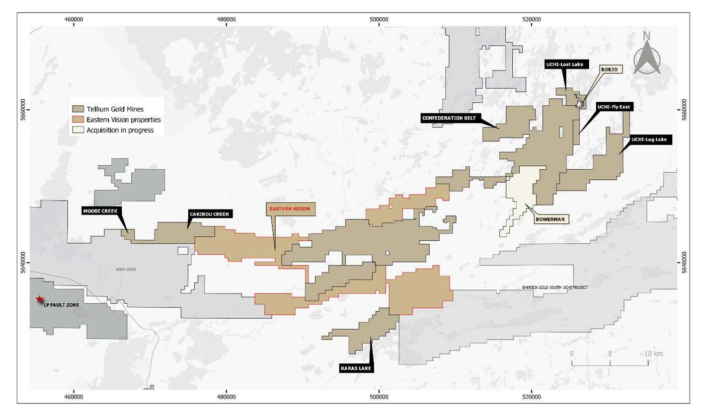 VANCOUVER, British Columbia, June 22, 2022 (GLOBE NEWSWIRE) -- Trillium Gold Mines Inc. (TSXV:TGM, OTCQX:TGLDF, FRA:0702) (“Trillium Gold” or the “Company”) is pleased to announce that it has closed the acquisition in respect of the majority of Imagine Lithium Inc.’s (“Imagine Lithium”) Eastern Vision property holdings in the Confederation Lake assemblage, within the Birch-Uchi greenstone belt in the Red Lake Mining District of Ontario. (See news releases of April 27, 2022, December 15, 2021 and July 19, 2021.) These property holdings include properties that Trillium has acquired directly and others for which Trillium has assumed option agreements as optionee.