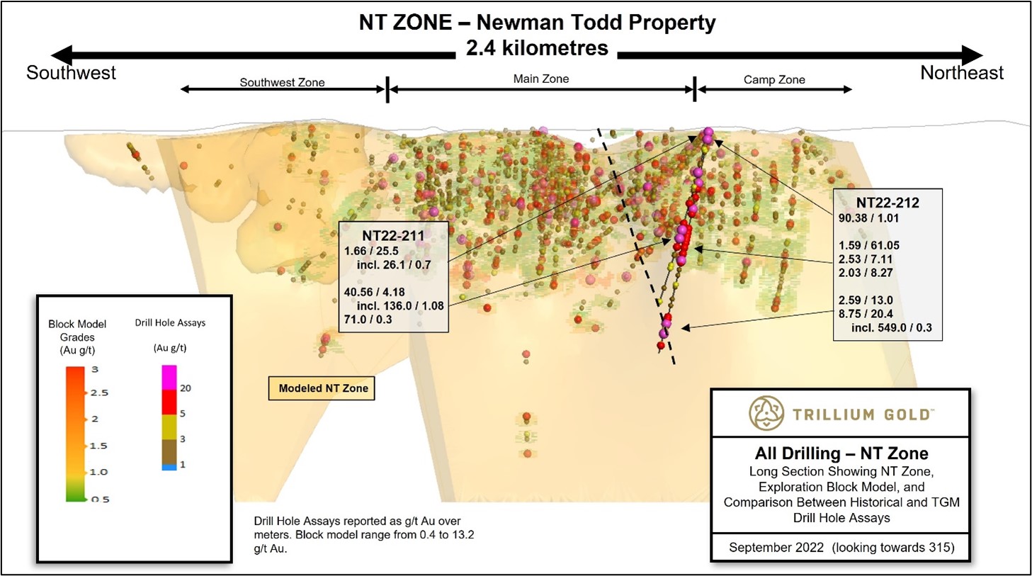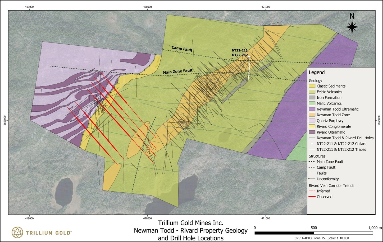 William Paterson, Trillium Gold’s Vice President of Exploration added, “These results are the most significant received to date at this depth at Newman Todd and signal the potential for additional resources associated with intersections between the bonanza-grade Rivard veining and east-west structures. Our more meaningful high-grade intersections previously reported - holes NT20-169 [7.05m at 15.41 g/t Au including 4.3m at 23.88 g/t Au and 1.12m at 69.85 g/t Au], and NT21-194 [9m at 19.73g/t Au including 1.55m at 102.16 g/t Au] on the Camp Fault, and now holes NT22-211 and -212 on the Main Zone Fault, have all occurred at these intersections and we believe we will be able to apply this established theory successfully at depth, which remains completely open.” [See Trillium Gold’s news releases at www.trilliumgold.com or its filings on www.sedar.com]