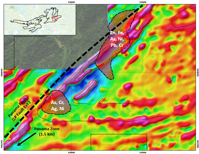 An airborne electromagnetic lineament coincident with the gold-bearing Panama Zone shows the Panama Zone and Panama Fault North Trend continuing to the northeast where recently completed enzyme leach soil surveys identified multiple overlapping anomalies for arsenic, nickel, zinc, silver, and chromium (Fig. 4). Arsenic in soil is a strong pathfinder candidate for gold mineralization based on historical geochemistry work performed on drill holes completed by Benton Resources in 2019 and a baseline soil line completed over the Panama Zone by Trillium in 2022.