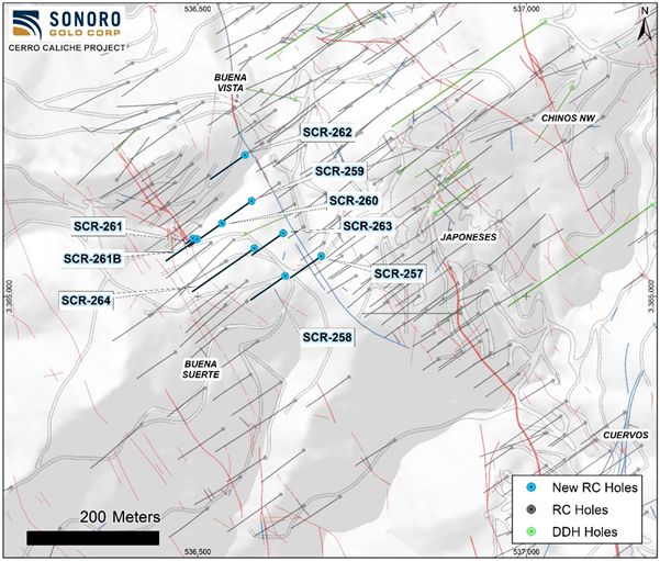 John Darch Sonoro’s Chairman commented, “These final drill results reinforce the potential for the Japoneses-Buena Vista and Buena Suerte zones to be assessed as a single pit with all of the attendant cost savings that a single pit may make possible. They also mark the conclusion of an exceptional year, where Sonoro has been transformed from an exploration junior to a development stage company with a goal of achieving production early next year. Our strategy of exploring and developing Cerro Caliche’s extensive shallow oxide gold mineralization while advancing towards becoming a gold producer is advancing as we had hoped. We anticipate this will be confirmed with the filing of the Micon International’s 43-101 technical report on an updated resource estimate, as well as with the filling of the anticipated PEA regarding the proposed project’s economics.”