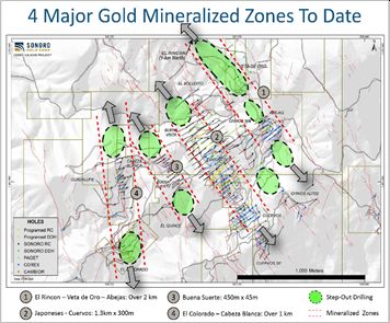 VANCOUVER, British Columbia, Dec. 18, 2020 (GLOBE NEWSWIRE) -- Sonoro Gold Corp. (TSXV: SGO | OTCQB: SMOFF | FRA: 23SP) (“Sonoro” or the “Company”) is pleased to report very favourable results from its current step-out and infill drilling programs. The current programs have demonstrated a material expansion of several mineralized zones, most notably at Japoneses, Buena Suerte, Veta de Oro, El Rincon and El Colorado (see map below). Based on these results, the Company is revising the parameters for a planned Preliminary Economic Assessment (PEA) to assess the viability of Heap Leach Mining Operation (HLMO) by increasing the target conceptual capacity from 8,000 tonnes per day (tpd) to 20,000 tpd.