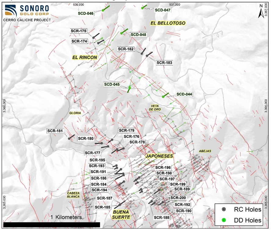 John Darch, Chairman of Sonoro, also noted: “The continued expansion of the Buena Suerte Gold Zone and the positive drilling results at El Rincón and the newly identified Bellotoso zone brings us closer to our goal of developing a major bulk-tonnage, oxide gold resource with the potential to provide a source of production and revenue in the years to come. At the same time drilling at the Japoneses zone is making an essential contribution to the project’s conceptual plan, to be addressed in a 2021 PEA, to develop a heap leach mine operation having an initial capacity of up to 20,000 tonnes per day.”