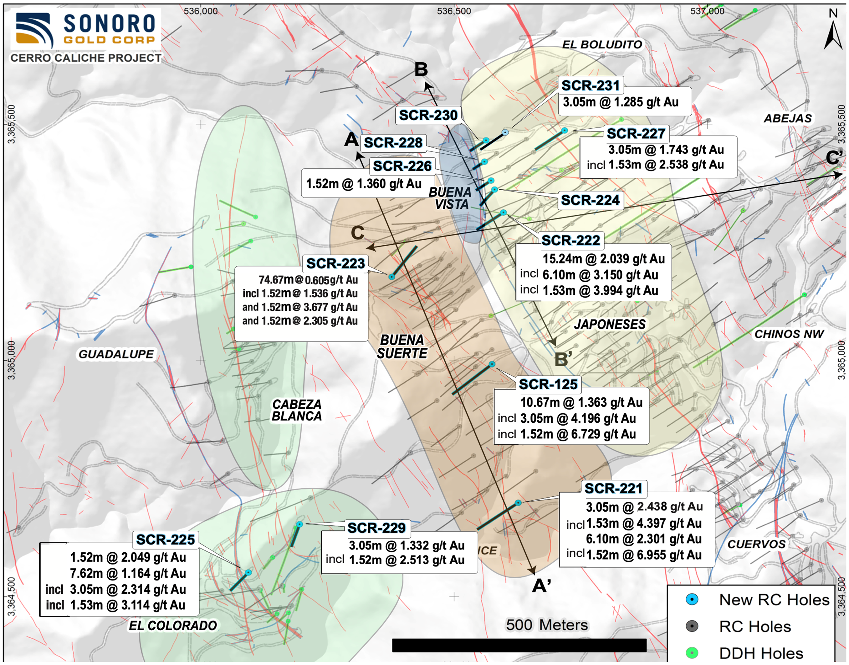 Approximately 150 meters east of Buena Vista, within the northern extension of the Japoneses gold mineralized zone, infill drill hole SCR-227 intercepted 3.05 meters averaging 1.743 g/t Au including 1.53 meters averaging 2.538 g/t Au.