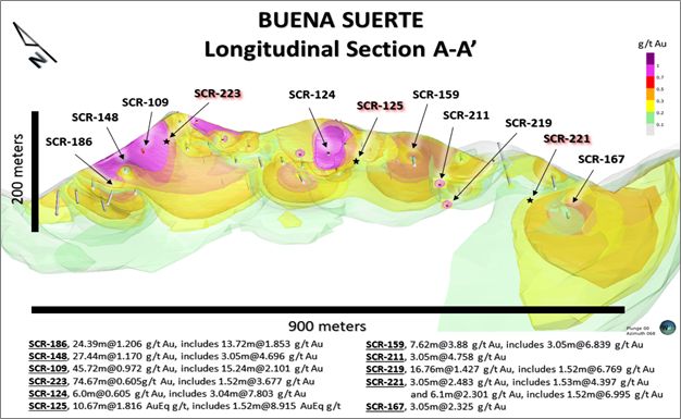 - Drill hole SCR-223 in the north western extension of Buena Suerte intercepted 74.67 meters averaging 0.605 g/t Au including three intervals of 1.52 meters averaging up to 3.677 g/t Au.