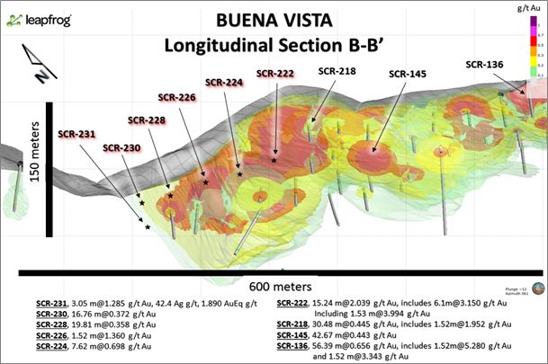 The image below illustrates a 600-meter longitudinal section of drill holes at Buena Vista.