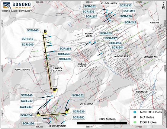 Veins from the El Colorado zone connect northward mainly with the Cabeza Blanca Vein zone and the Guadalupe vein. Drill hole SCR-246 located in the deep canyon between El Colorado and Cabeza Blanca shows several short connecting mineralized intervals where the Guadalupe and Cabeza Blanca veins intercept.