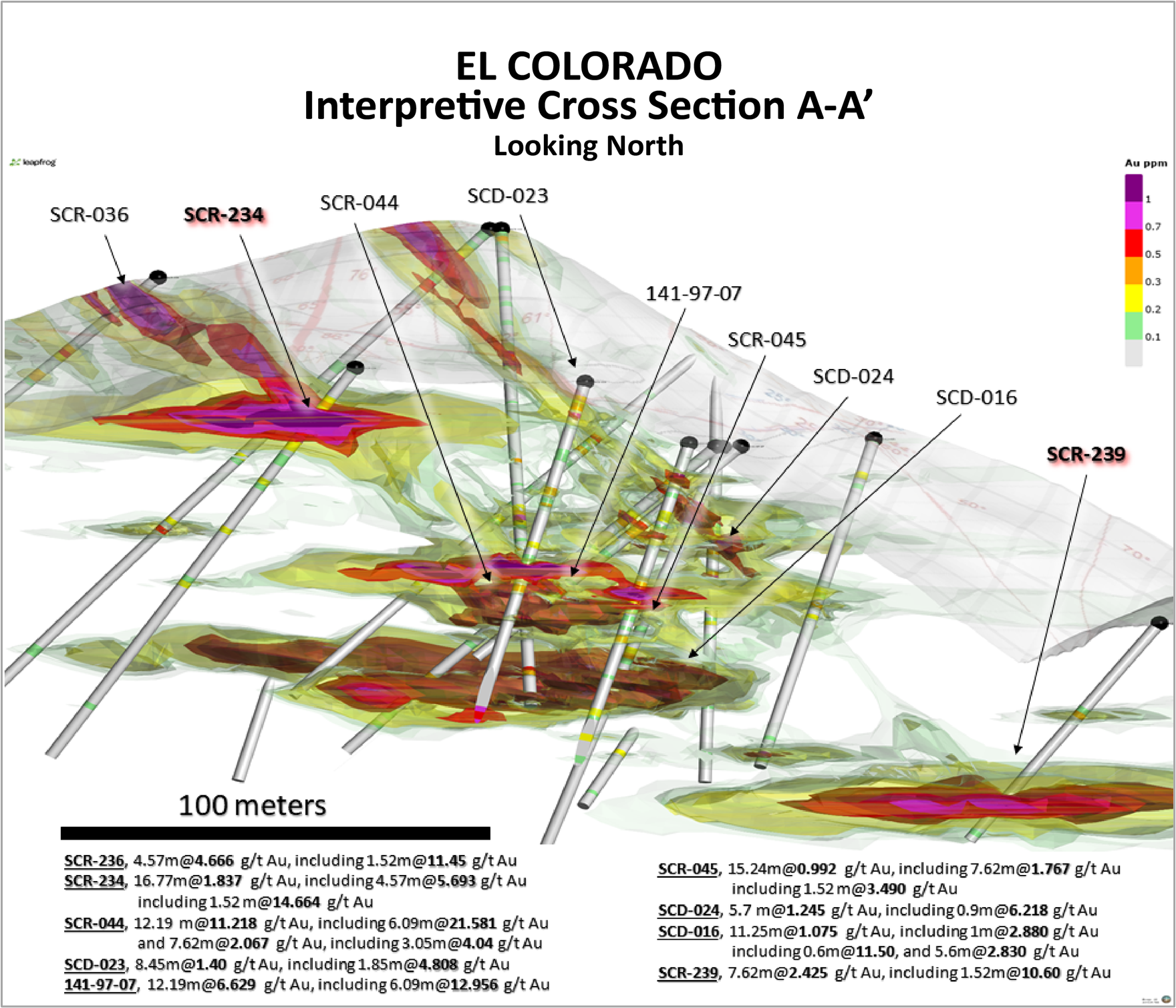 - SCR-239 in the eastern extension of El Colorado intercepted 7.62 meters averaging 2.425 g/t Au; including 1.52 meters averaging 10.6 g/t Au.