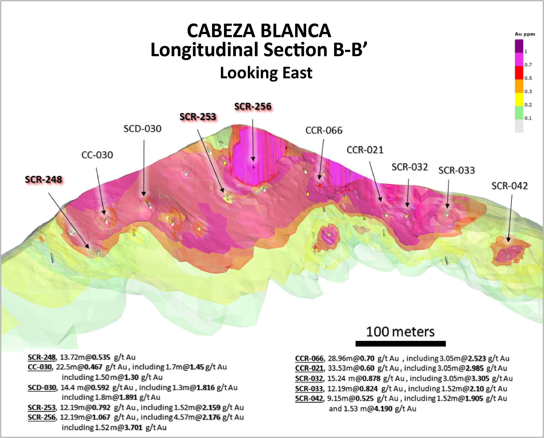 Among the six-drill holes recently completed at Cabeza Blanca, SCR-256 is the furthest south and is located approximately 35 meters north of the previously announced SCR-096 which intercepted 16.76 meters averaging 0.841 g/t Au including 4.57 meters averaging 2.419 g/t Au.