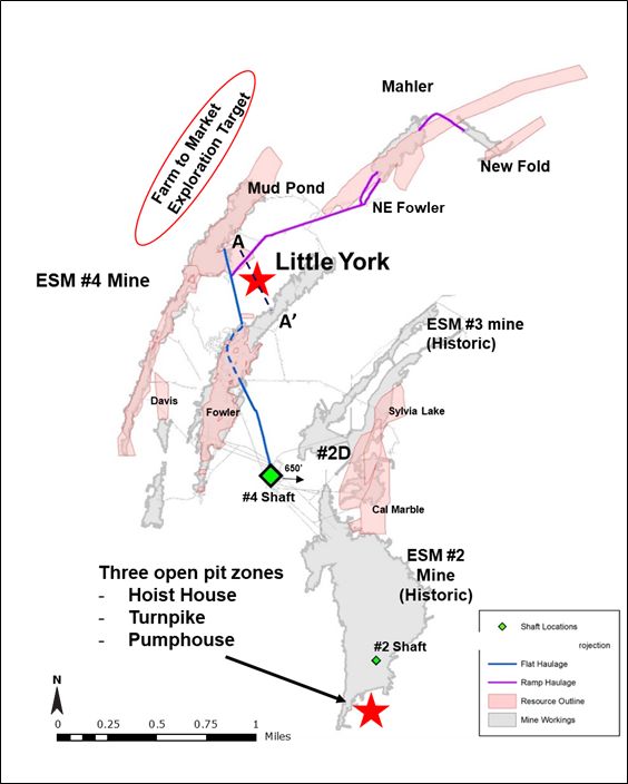 The Little York target is situated between Upper Fowler and Mud Pond, two known mineralized trends in the ESM #4 mine. Upper Fowler was historically mined and is located 500 feet to the east of Little York at approximately the same elevation. Mud Pond, currently an active mining area, is situated approximately 1,000 feet below Little York.