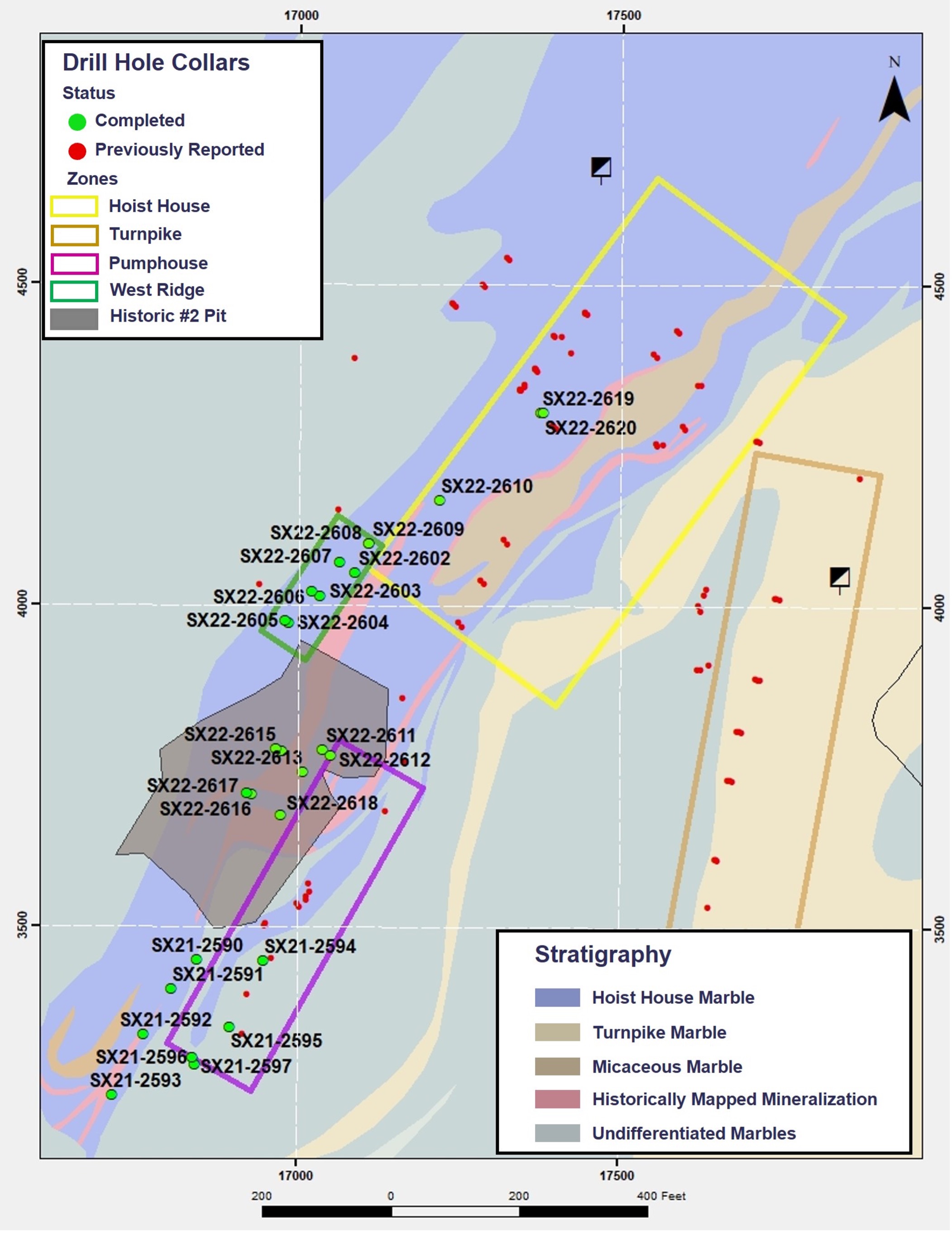 In Q1 2022 a 27 hole drill program was completed in and around the #2 Ore Body. This drilling has successfully extended mineralization to the SW of the Hoist House Zone and identified a new zone of mineralization labeled West Ridge (see Figures 1 and 2). Eight holes have been completed within the historic #2 pit, targeting the remnant crown pillar, returning positive results and extending the previously drilled zinc mineralization in this area. Additionally, two holes have been drilled targeting the down dip extension of mineralization at the planned Turnpike open pit.
