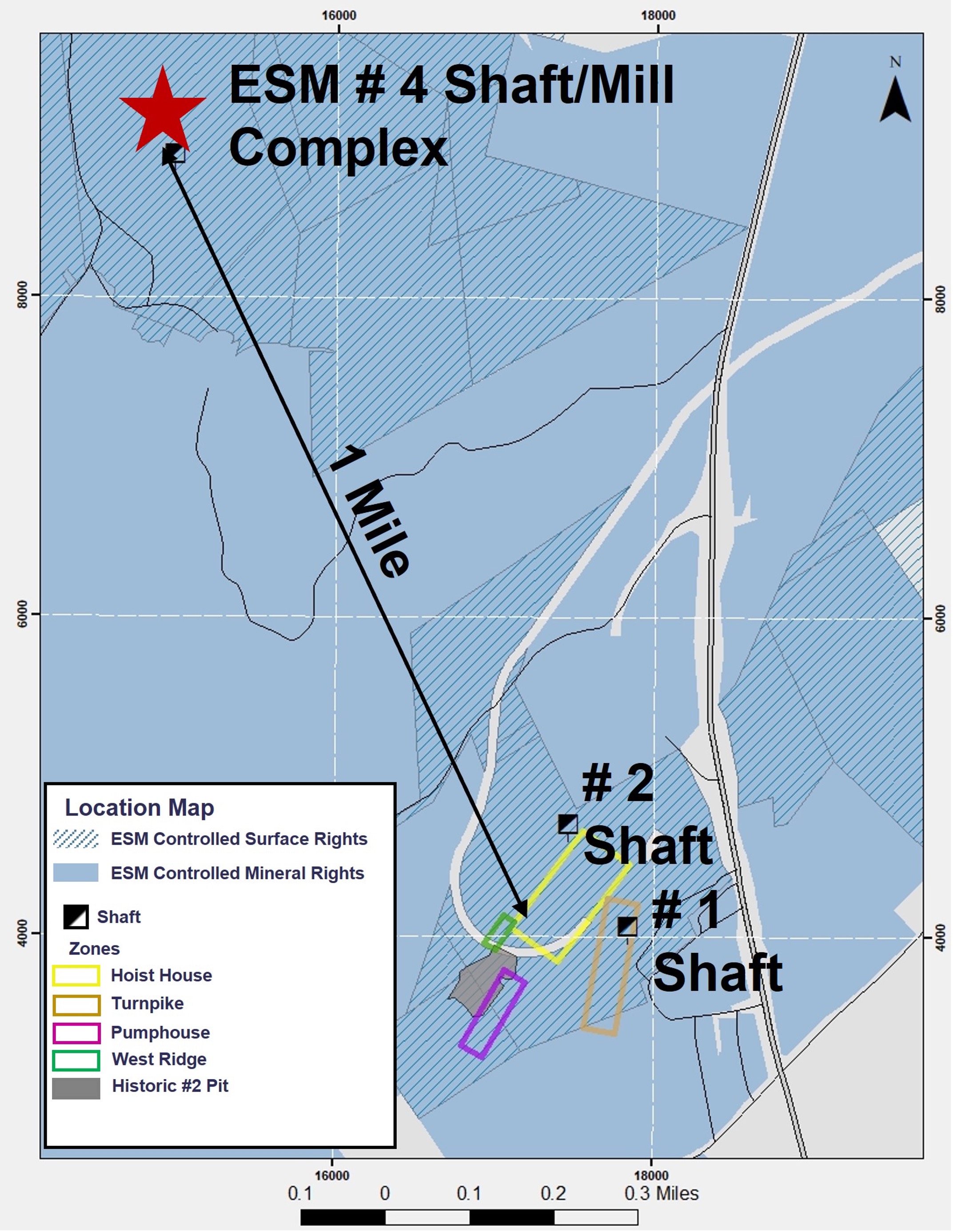 The #2 pit is located 1 mile south of the ESM # 4 mine and milling complex. Drilling has tested remnant crown pillar mineralization to the southwest of the previously identified Hoist House Zone (Figures 1-2) and the remnant mineralization beneath the #2 Pit. Mineralization has been intercepted within the gaps of the historic #2 surface and underground workings.