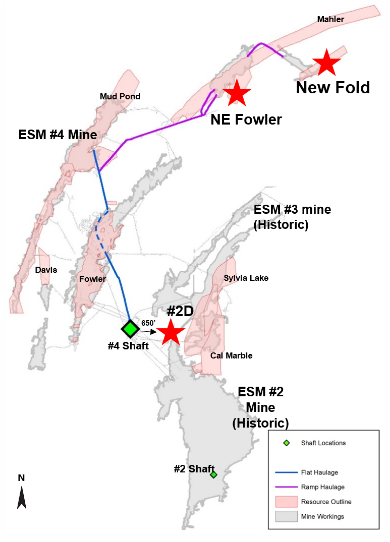 In 2018, 14 holes totaling approximately 16,200 feet were drilled to test the up-plunge extension of the mineralization at the NE Fowler zone, and to upgrade the 2018 PEA resource classification from the inferred category to the indicated category. The drill program demonstrated the up-plunge continuity of mineralization. Drilling also indicated that the mineralization thickens to the west and north, and remains open in both directions. Based on the current drill results, it appears that the thicker and higher-grade portion of the NE Fowler mineralized zone is situated further to the north/northwest and will be the target of future drilling.