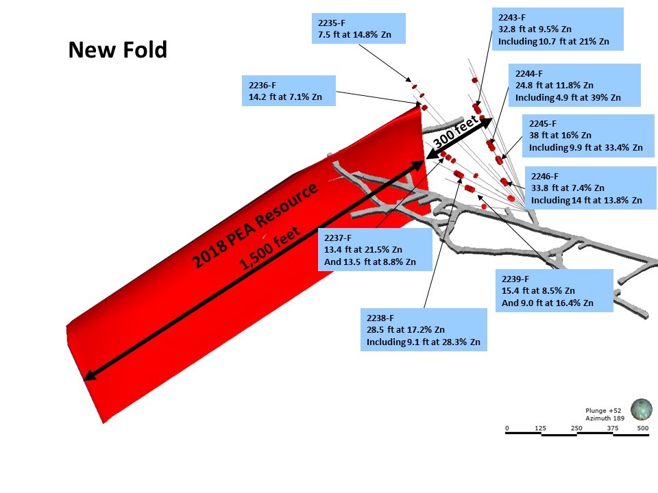 An 18-hole underground exploration program was carried out in early 2019. The program was designed to test the southern extension of the mineralization in the New Fold zone. The drilling confirms that high-grade zinc mineralization extends at least 300 feet up-plunge from the mineral resource included in the 2018 PEA(2). The mineralization in the New Fold zone now extends over 1,800 feet from southwest to northeast, and remains open to the northeast.