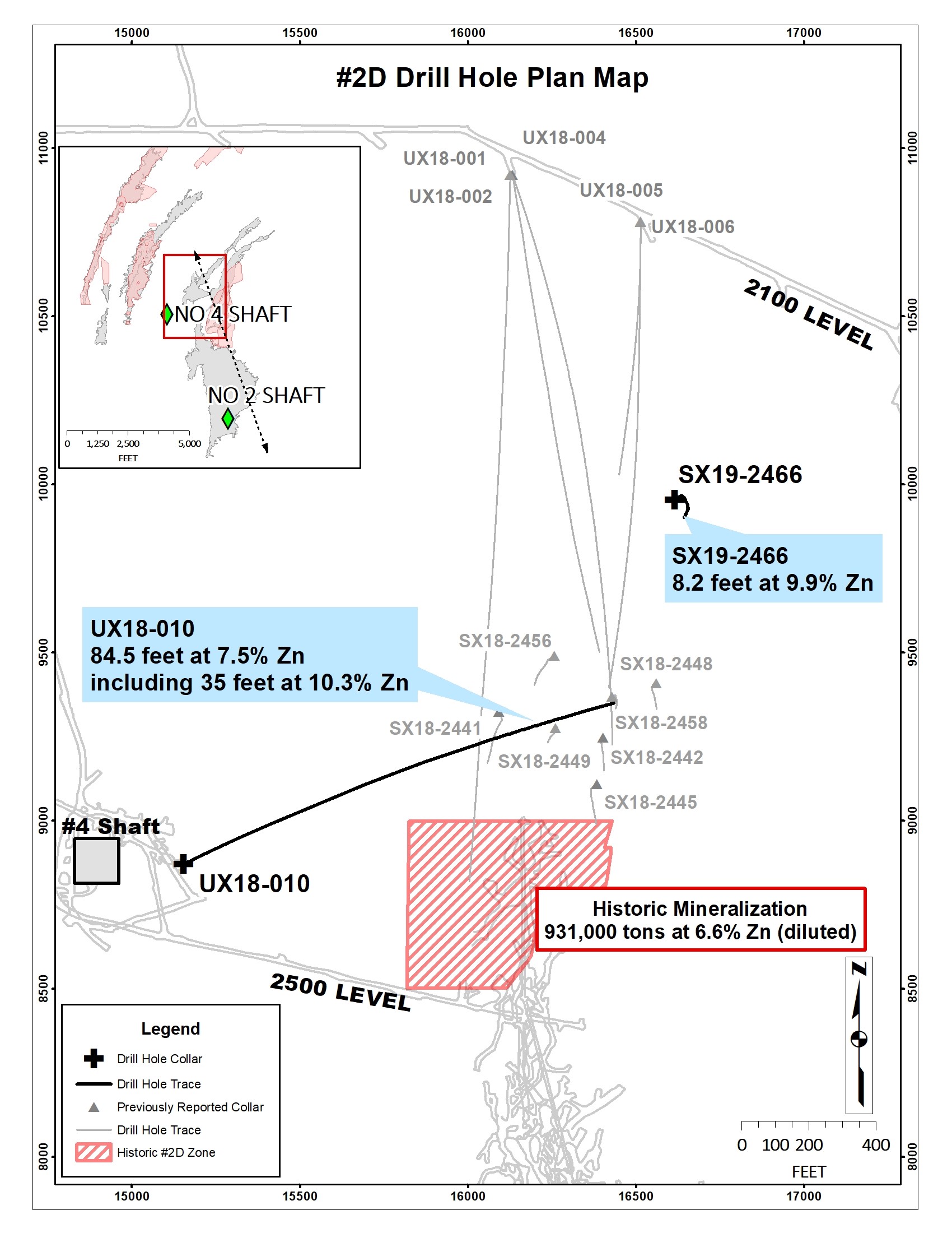 Underground infill drilling continues to define the continuity of high-grade mineralization in the central portion of the #2D mineralized zone. In this area, the zone is 50 feet to 100 feet thick along a defined fold hinge which extends approximately 1,500 feet northeast from the historic mineralization. The recent drill holes also intercepted high-grade mineralization in the #1D zone, located approximately 275 feet below the #2D zone. Drilling results indicate that the grade of the mineralization in the #1D zone increases to the northeast and the zone remains open in that direction.