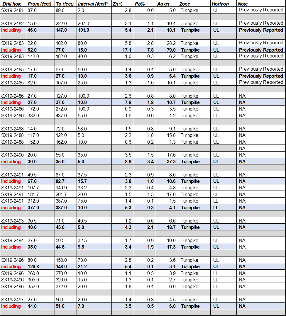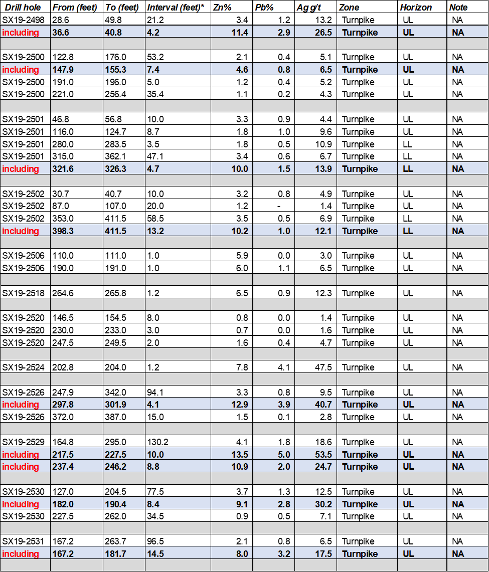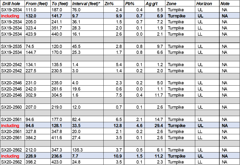 - Turnpike Zone: Step out and infill drilling continue to confirm mineralization continuity along strike and down-dip with hole SX20-2561 returning 82.4 feet assaying 6.5% zinc, 2.1% lead and 14.7 g/t silver, including 33.5 feet assaying 12.8% zinc, 4.6% lead and 29.4 g/t silver.