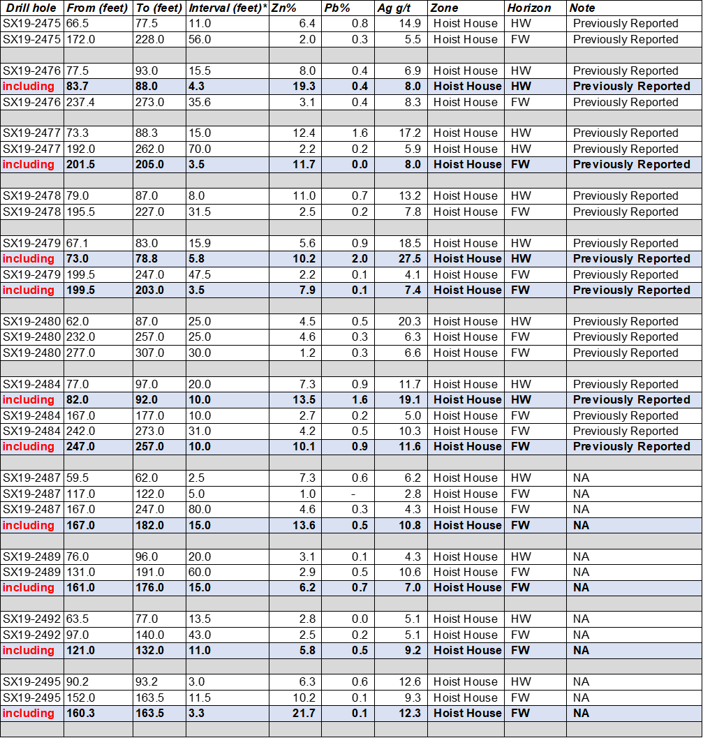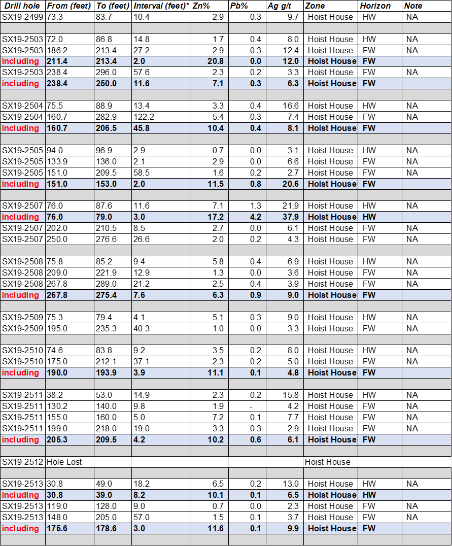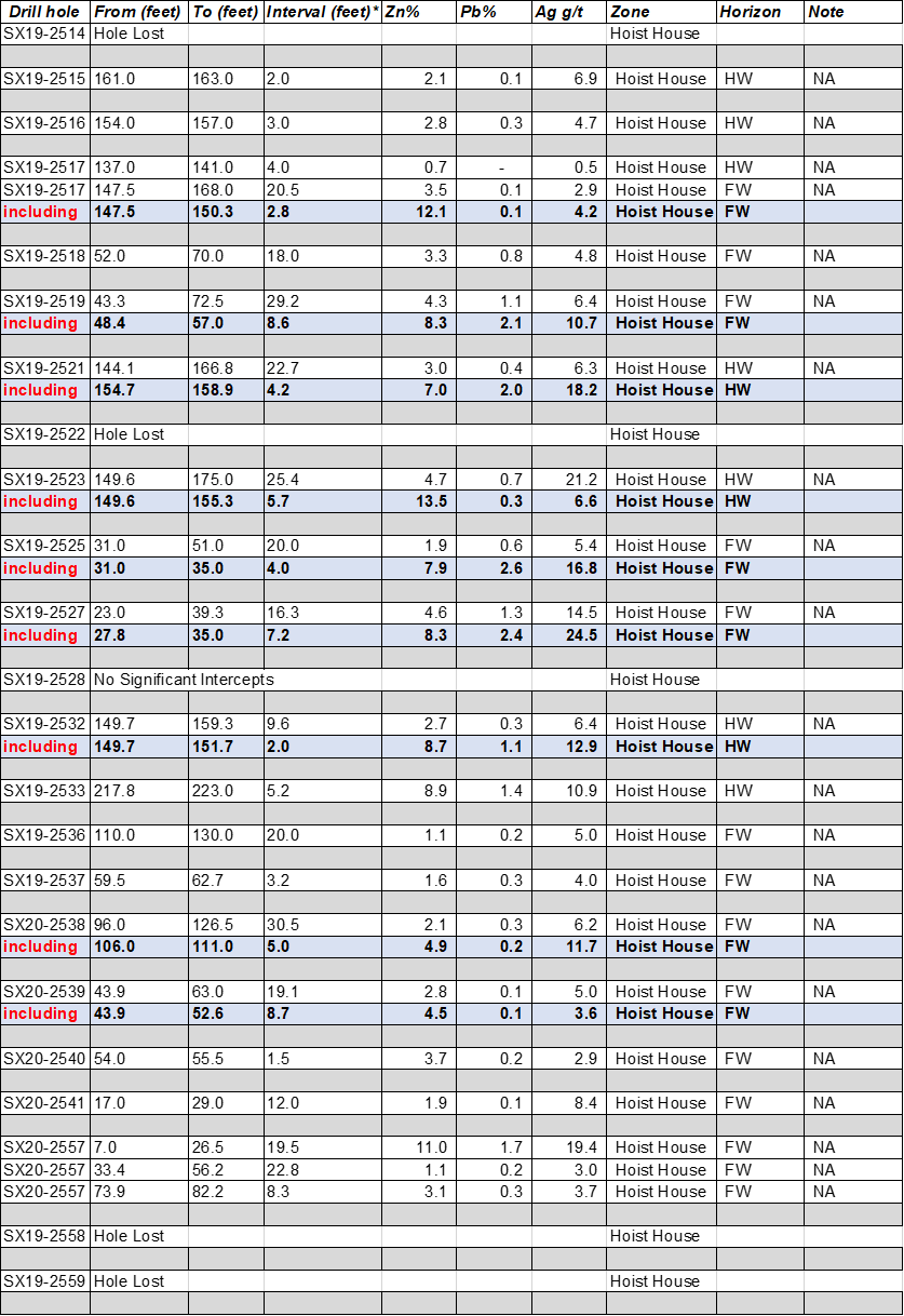 - Hoist House Zone: Strike length extends to 750 feet with hole SX20-2557 returning 19.5 feet assaying 11.0% zinc, 1.7% lead and 19.5 g/t silver.