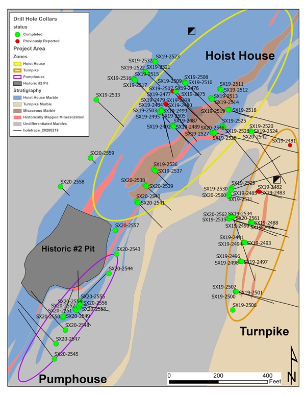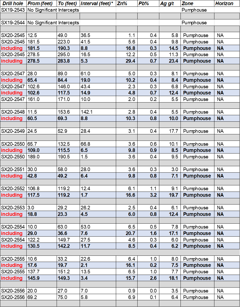 - Pumphouse Zone: Drilling has defined a zone of mineralization 25 feet thick over a strike length of 300 feet extending to a depth of at least 150 feet with hole SX20-2554 returning 53.0 feet assaying 6.5% zinc, 0.5% lead and 7.8 g/t silver, including 7.6 feet assaying 20.7% zinc, 1.6% lead and 17.1 g/t silver.