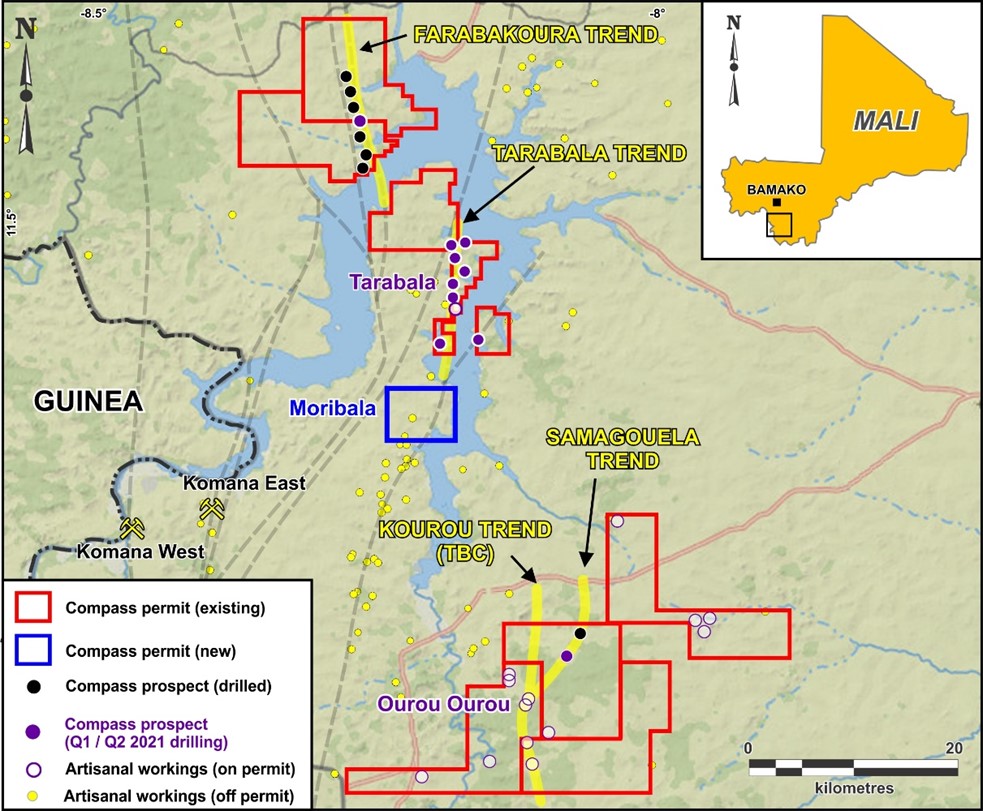Compass CEO, Larry Phillips, said, “Our deeper drilling on the Tarabala prospect has intercepted wide intervals of low-grade mineralization punctuated with some much higher gold grades. Although these sections have not demonstrated the continuity required for a standalone, open-pittable gold resource, we remain confident that the Tarabala Trend has strong potential to host a concentrated zone of mineralization. We have acquired the right to explore approximately an additional 6.5 kilometres of this trend. Dr. Madani and his team have just finished an auger drilling program on our new Moribala permit, where shallow soil sampling during the summer returned a gold assay of 43.6 g/t Au. This is one of the highest recorded gold grades from southern Mali, located just 10 km to the south of the Tarabala target zone.”