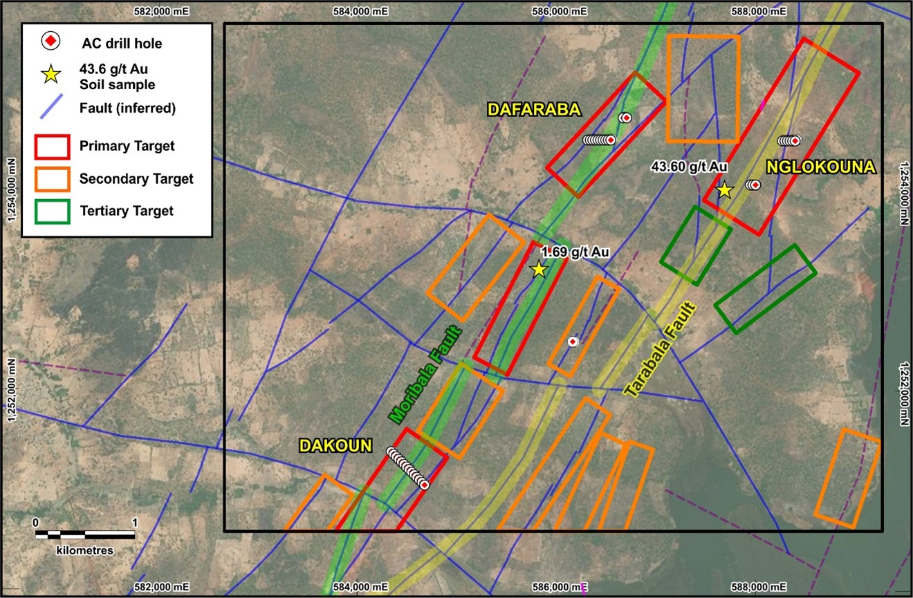 The targets are associated with the NE-trending faults that comprise the Siekorole shear zone, in particular along the Moribala and Tarabala faults. Four primary targets were identified, nine secondary, and two tertiary. All of the targets have merit, in a permit with little to no exposure of the bedrock geology.