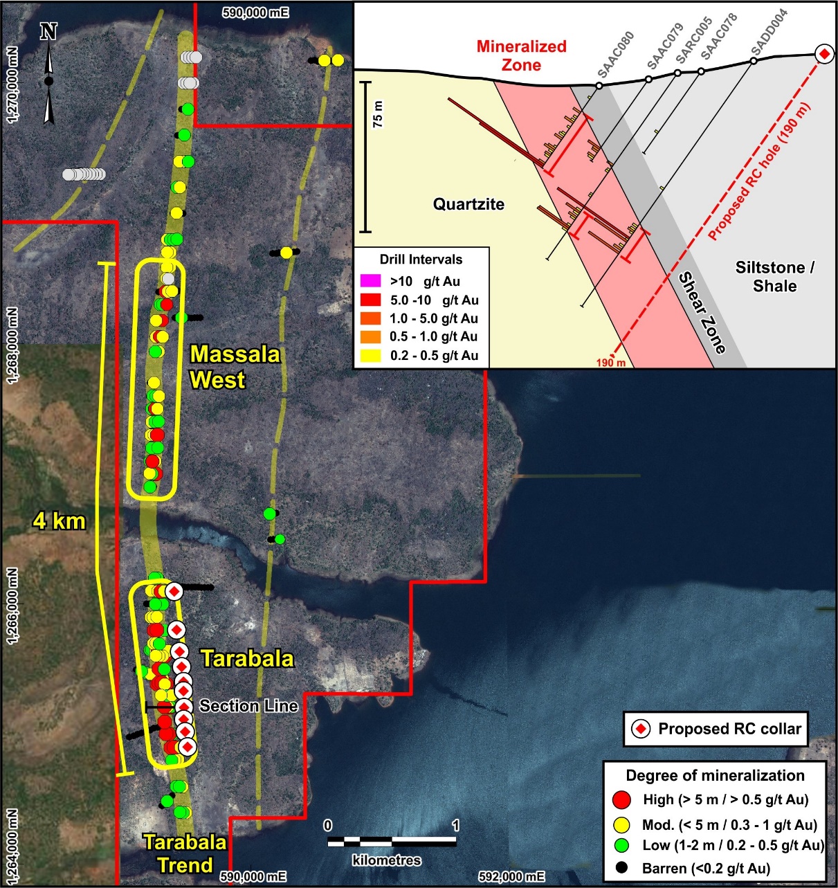 At Massala West, two kilometers further north, AC drilling identified two discrete mineralized zones greater than 550 m. The northernmost zone contained the widest mineralized interval and the highest grade. Drill hole SAAC123 returned 24 m @ 2.35 g/t Au (from 18 m), which included 1 m @ 26.80 g/t Au (from 35 m). RC drilling in the two zones identified several mineralized intervals, including 6 m @ 1.02 g/t Au (from 43 m; SARC010). If deeper drilling at Tarabala continues to be as encouraging, additional drilling will be performed.