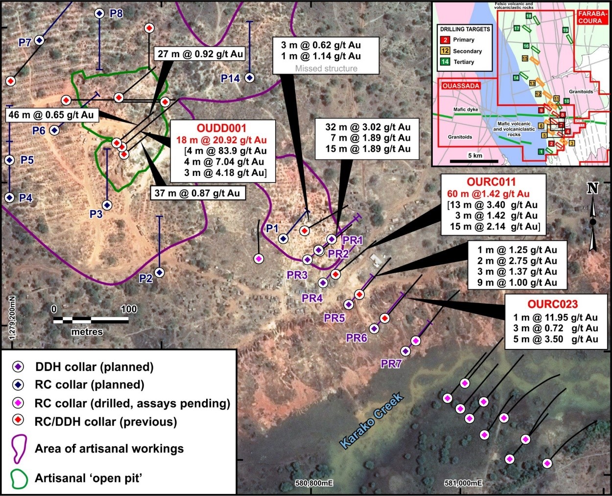 RC drilling south of the Karako Creek has been completed and the Company is awaiting assays from three holes. RC drilling will now focus on targets at Farabakoura that contain quartz-tourmaline veins being working by the artisanal miners.