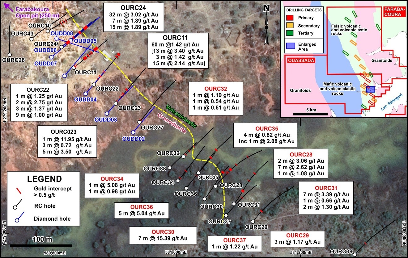 All other RC holes in the latest program (OURC26, OURC039-043, OURC046-048) were designed to test east-west trending gold-bearing quartz-tourmaline veins identified in artisanal bedrock workings. These veins appear to be at, or near, the contact with a late granodiorite intrusion, such as the 1 m interval containing 329.92 g/t Au in OUDD01. Samples from these holes are currently at the assay lab and will be released when available (likely in approximately three weeks).