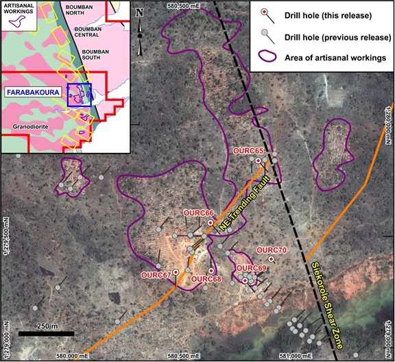 - Drilling at the Farabakoura artisanal workings intersected a NE-trending structure containing multiple (9) gold zones in one hole (OARC65 included 8 m at 1.17 g/t Au, (from 33 m), 4 m @ 0.81 g/t Au (from 61 m), and 3 m @ 1.54 g/t Au (from 73 m))