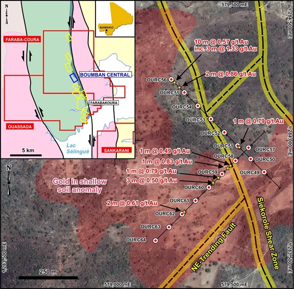 The best mineralization occurred in drill hole OURC56, where six discrete zones of mineralization were intercepted within a granodiorite. The best intercept was 3 m @ 1.33 g/t Au (from 29 m), within 10 m @ 0.57 g/t Au. This mineralization is located to the west of the main Siekorole Shear Zone in a geological setting similar to the mineralization encountered at Farabakoura, 5 km to the south, and the Komana East open pit (owned by Hummingbird Resources PLC), 40 km to the south-southwest. The similarities are based on: the location of the shear zone bounding fault; the metamorphosed sedimentary rocks to the east of the fault (sandstones, siltstone, black shale); and the metamorphosed intrusive (granodiorite), volcanic (basalt and dacite) and volcaniclastic (tuffs) present to the west of the fault. The presence of gold mineralization encountered at Boumban emphasises that the rocks to the west of the Siekorole Shear Zone are the main target. The Boumban target area is 4.7 km by 1 km, and the additional planned drilling will focus on prospective intrusions and structures there.