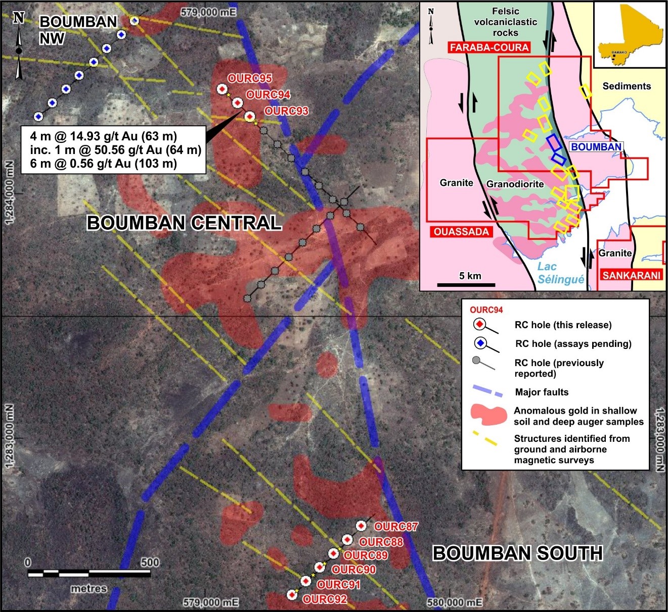Three holes (360 m) were completed at Boumban Central in mid-January (Figure 1) to follow-up on gold mineralization noted in OURC56 on the prospect during drilling in December 2019 (see Compass press release, January 14, 2019). OURC56 intercepted 10 m @ 0.57 g/t Au (from 31 m), including 3 m @ 1.33 g/t Au. Holes OURC93 to OURC95 were added to the northwest end of the previously drilled NW-trending fence into a shallow soil geochemistry and deep overburden gold anomaly (Figure 1). Drilling was performed by Capital Drilling, and collected samples were assayed at SGS (Bamako, Mali) by fire assay.