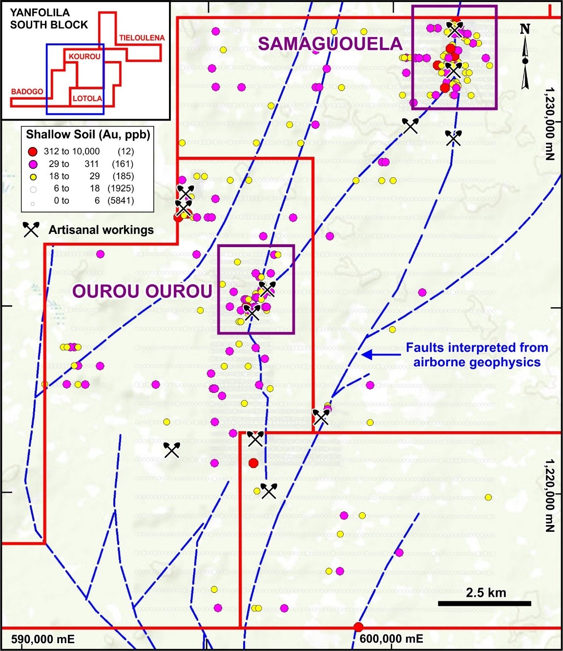 A second area, approximately 1.4 km south of the Samagouela workings, was also investigated. The primary target there was the interpreted offset of the north-south trending Samagouela fault and a large NE-SW oriented fault. This second fault is coincident with unnamed artisanal workings 2 km along strike and a broad gold in shallow soil anomaly at Ourou Ourou (Figure 1).