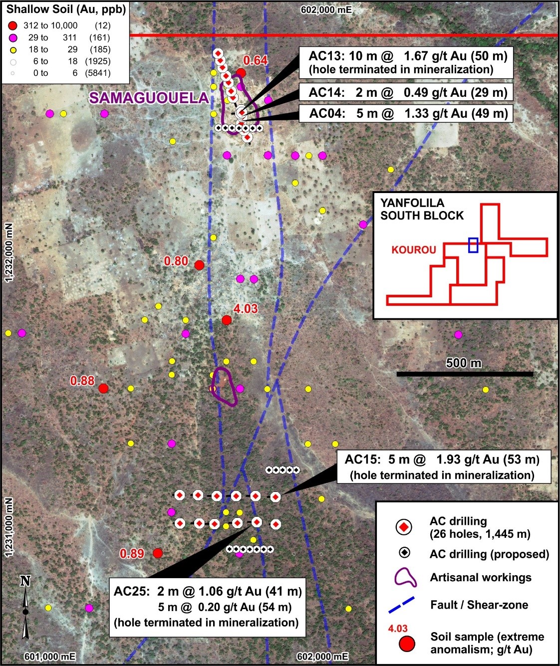 - Drilling encountered gold mineralization 1.4 km south of the Samagouela artisanal workings, including 5 m at 1.93 g/t Au (from 53 m), with mineralization open at the base of the hole