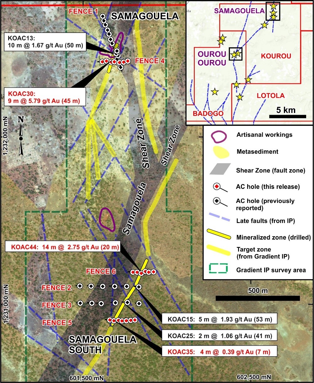 In mid-May, the Company completed 1,445 m of shallow drilling at the Samagouela gold workings, and in an area 1.5 km to the south, termed Samagouela South. Drilling in this area focused on a moderate shallow soil geochemistry anomaly that was associated with an interpreted northeast trending shear zone determined from Gradient Induced Polarization (IP) geophysical and structural mapping (Figure 1). The latest drill program comprised 920 m of air core (AC) drilling, and 72 m of RC drilling (used in areas of pronounced quartz veining). The drilling targeted two areas of mineralization. The first area underlies the artisanal workings at Samagouela that are interpreted from Gradient IP data to be associated with a 200-m-wide, north-trending shear zone. The second area is associated with a northeast-trending shear zone with a similar width. The shear zones are connected, but there is evidence that the northeast-trending shear zone might extend to the northeast, beyond the current Gradient IP survey (Figure 1).