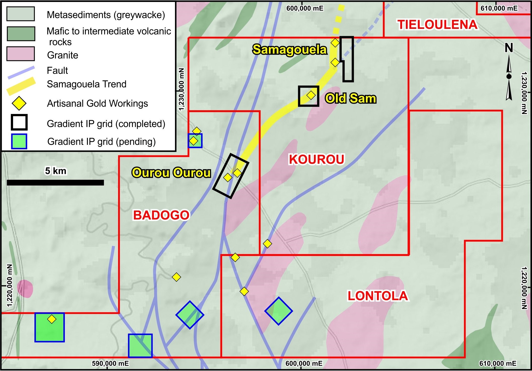 Fifteen anomalous areas that are coincident with favourable geology, regional scale faults, strong shallow soil geochemical anomalism, and the presence of artisanal workings were identified using a Gradient Induced Polarization (IP) survey. Three of the highest priority targets were on the Samagouela Trend (Figure 1 and Figure 2) extending nearly 10 km from the northeast of the artisanal workings at Samagouela North, through the workings at Old Samagouela (“Old Sam”), and on to more workings at OurouOurou. The Samagouela Trend appears to terminate against a north-northeast trending structure that displays enhanced gold in shallow soil anomalism, and might represent a new trend (tentatively named as the Kourou Trend). Survey data on these three Gradient IP grids will be forwarded shortly for processing and interpretation to Jeremy S. Brett, M.Sc., P.Geo. (MPH Consulting Limited), and results will be reported once that work has been completed.